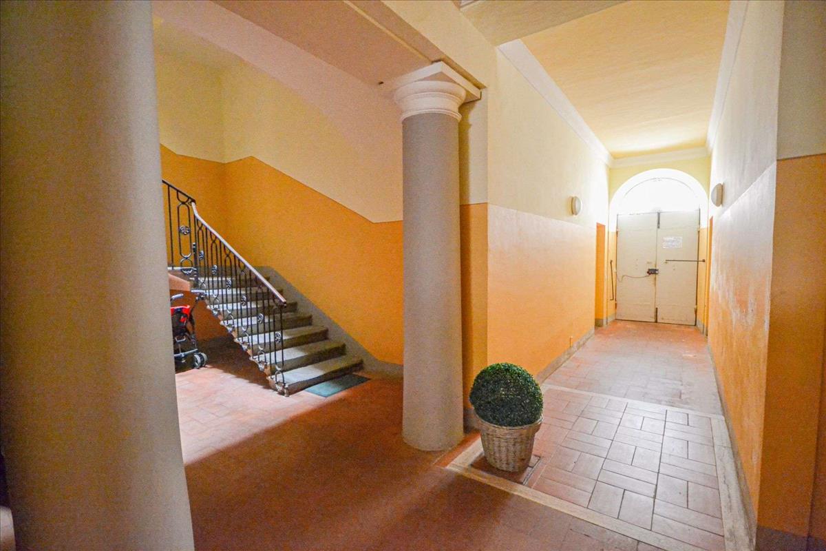 A történelmi központ szívében, egy kastélyban található harmadik emeleti apartman körülbelül 55 m², tágas nappali-konyhával, kétágyas hálószobával, egy hálószobával és fürdőszobával káddal.
