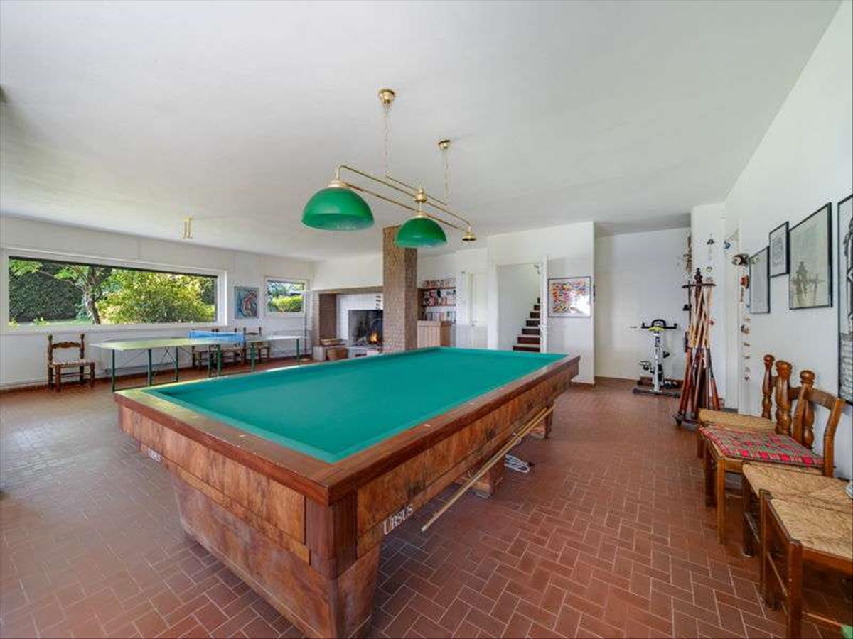 A fő villa három szinten helyezkedik el: a földszinten egy játékterem biliárdasztallal, műszaki terület, pince, mosókonyha, kandallós bár sarokkal, dupla garázs és külső portikó.