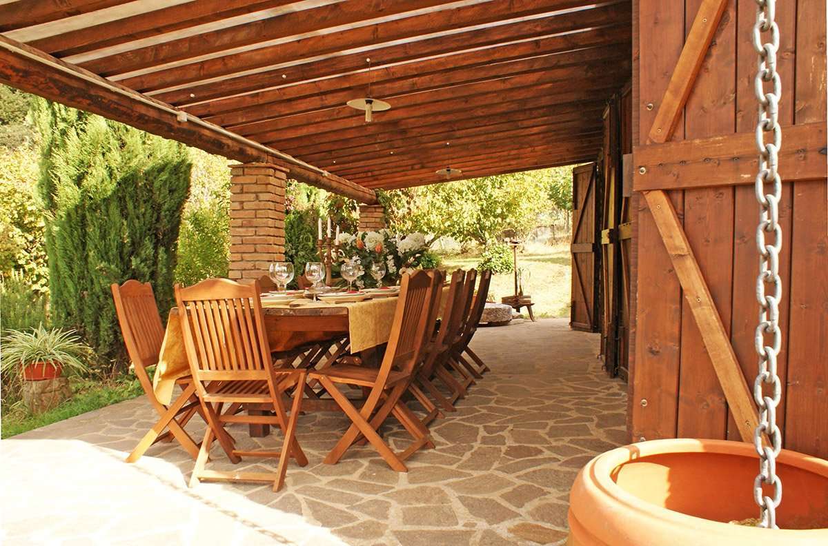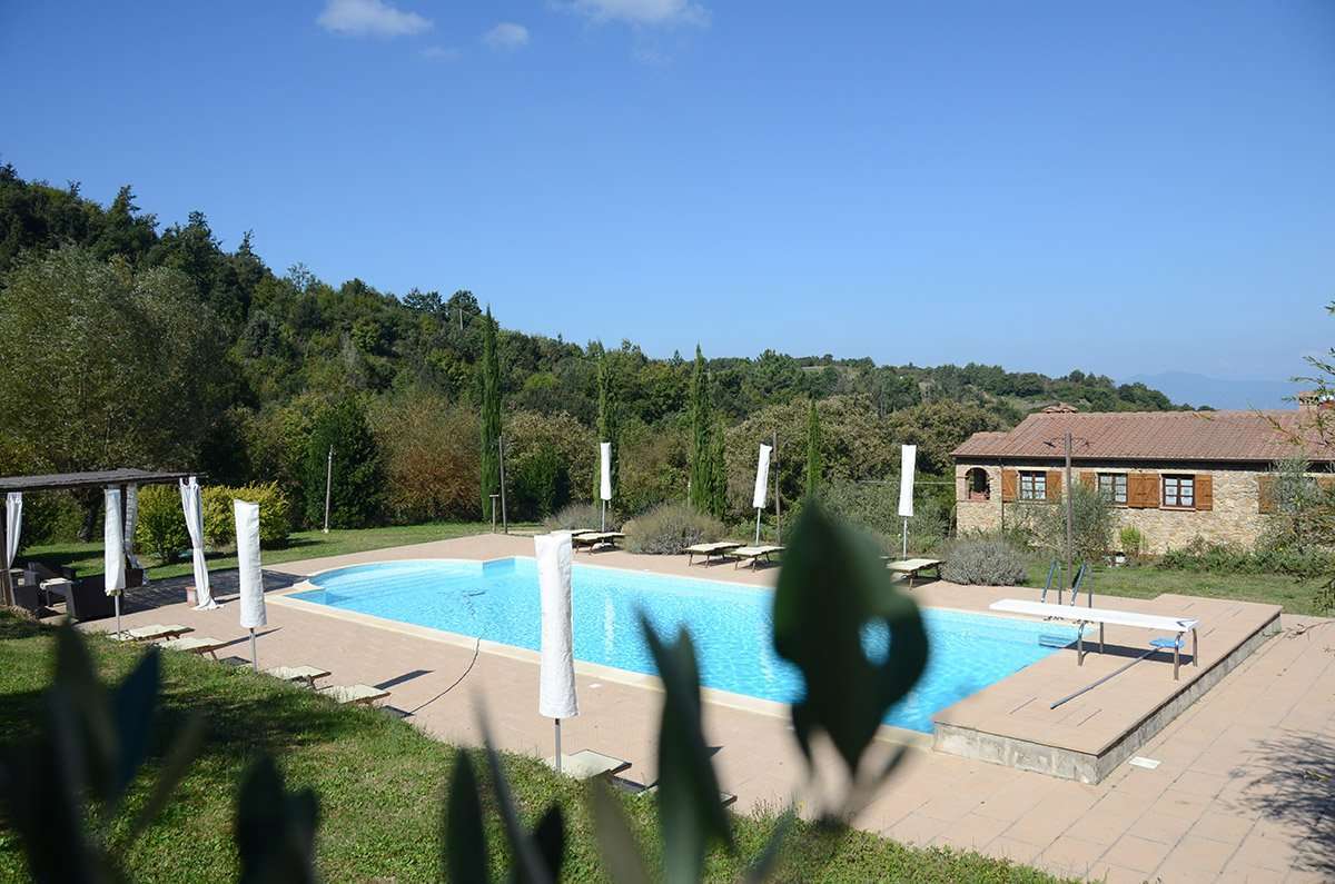 Kívül egy nagy úszómedence található, a ház feletti domináns pozícióban; látványos kilátás nyílik a völgyre.