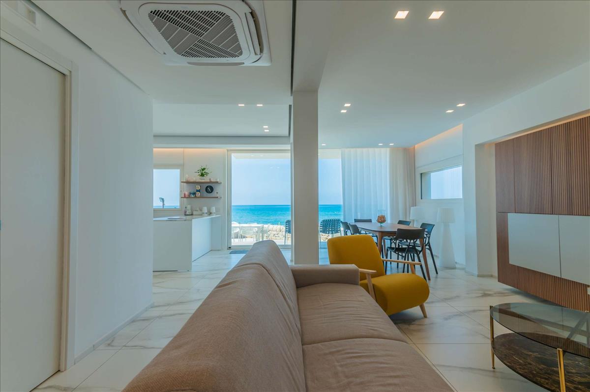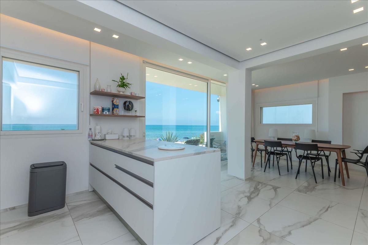 A teljesen felszerelt, félszigetes konyha a nappaliba nyílik, ahol a nagy ablakok zavartalan kilátást nyújtanak a veranda felé és a strandra.