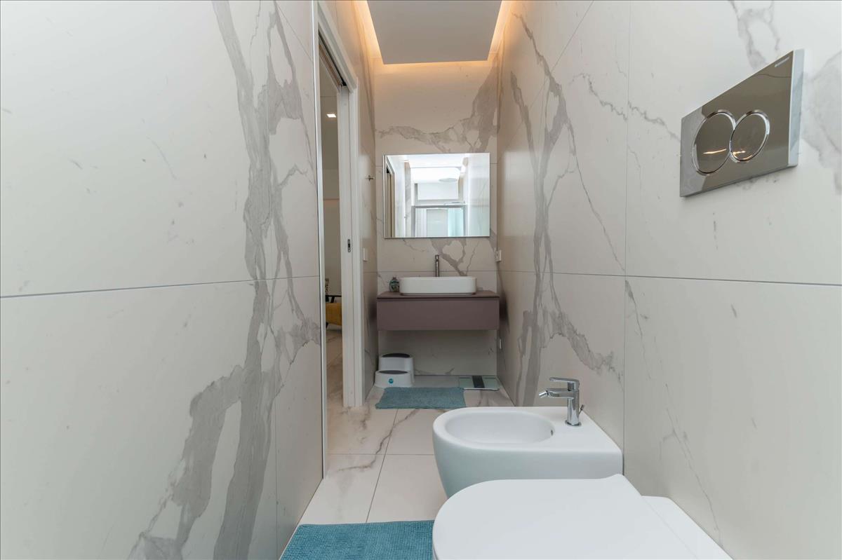 Földszinten egy modern fürdőszoba és két kényelmes gardróbszekrény található.