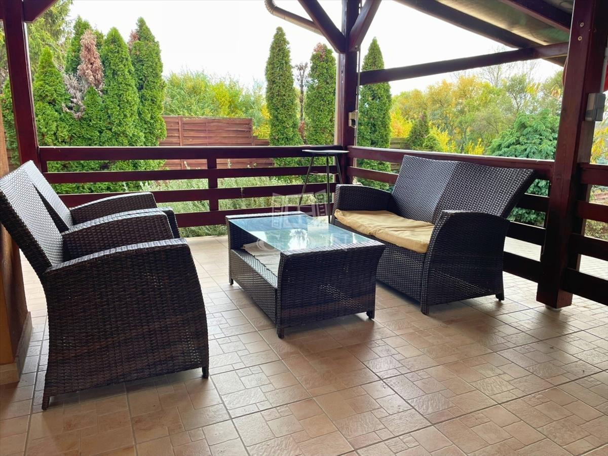 Télen-nyáron élvezhetjük a nappaliból és az udvarról is megközelíthető nagy, fedett teraszt, ami jó beszélgetések, pihenések ideális helyszíne.