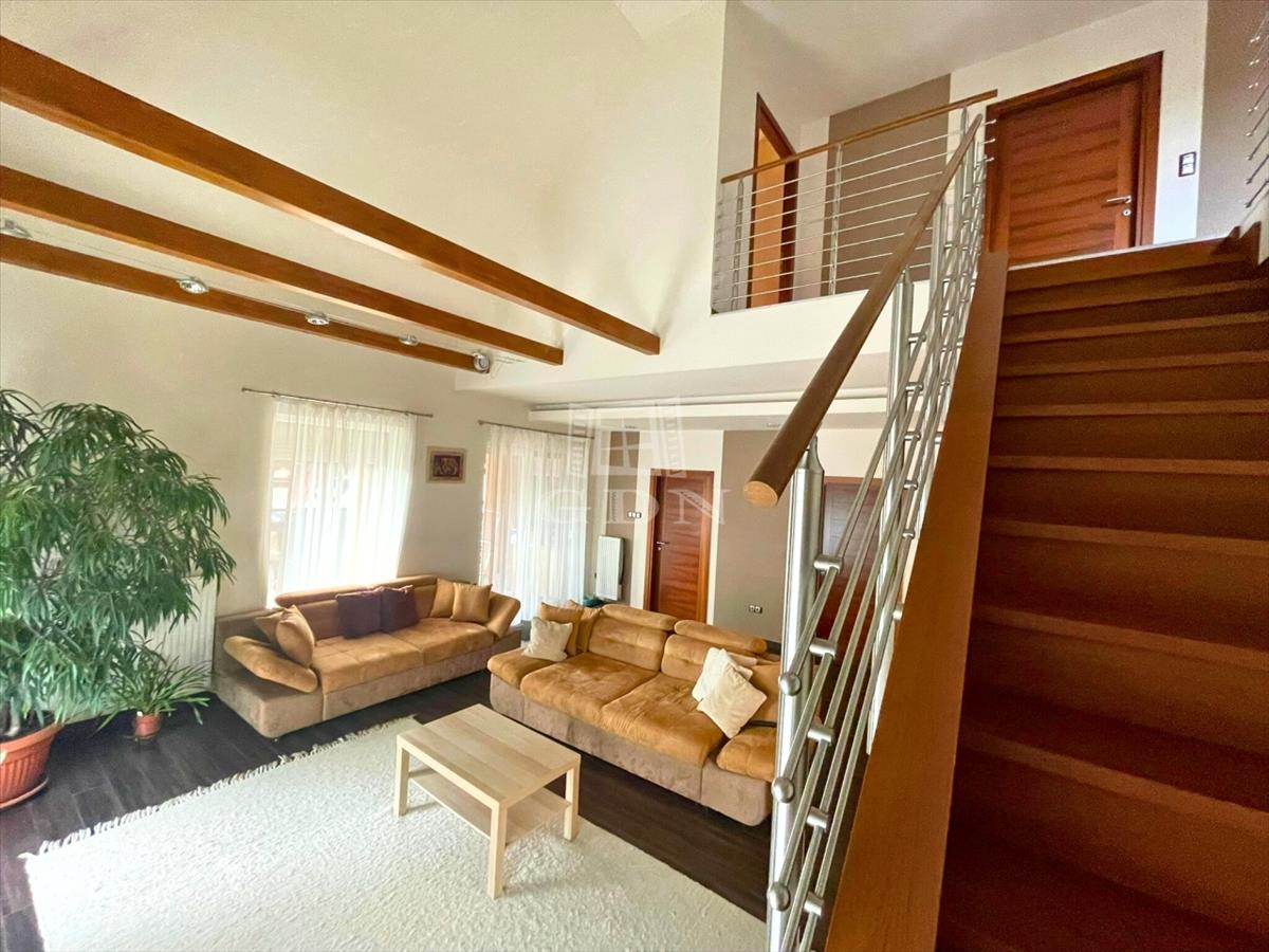 A házba belépve a közlekedőn át egy ízlésesen kialakított és meleg hangulatú térbe érkezünk, ahol 2 lépcsőfokos szinteltolással elkülönül a nagy étkező-konyha rész és a galériás kialakítás miatt, tágas és világos terekkel rendelkező, otthonos nappali.