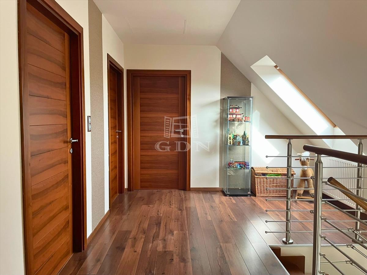 A nappali impozáns eleme sötétszínű, kényelmes lépcső, amely a tetőtérbe vezet. Itt 3 hálószoba és egy zuhanyzó+WC kapott helyet, kis előtérrel. a szobák hangulata a tető összetett kialakítása miatt igazi elvonulós, pihenős, privát helyek a család kisebb-nagyobb tagjai számára.