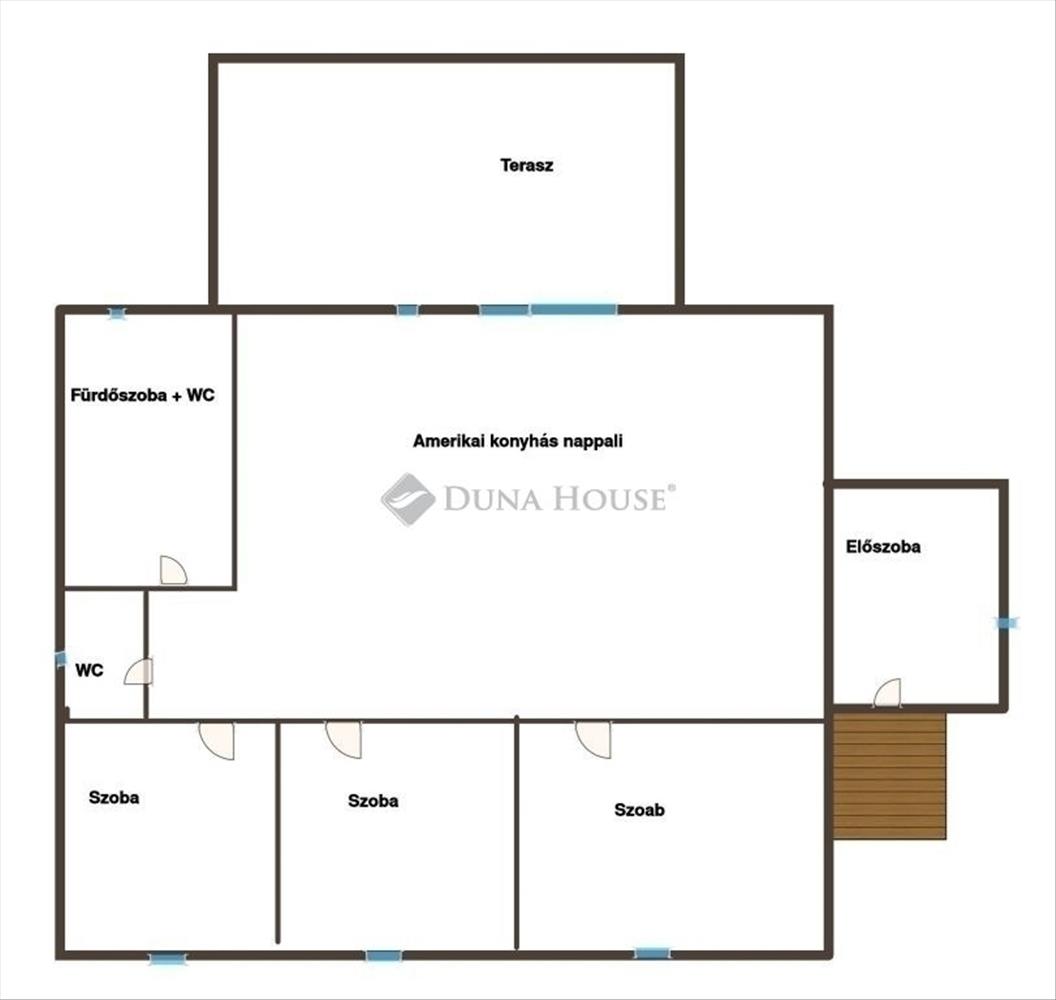 A ház 3 szoba + amerikai konyhás nappalis (szobák: 15, 5, 13, 5, 12, 5 m2; 44 m2 nappali; előszoba, fürdőszoba WC-vel, külön wc, + teraszok: 30 m2 és 1, 5 m2 ) nettó 97 m2