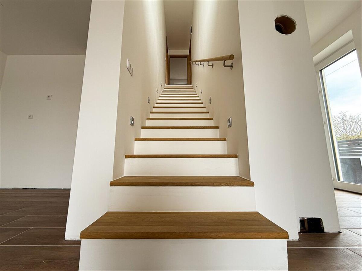 A két szintet egy elegáns, tölgyfa járólapokkal burkolt lépcső köti össze, beépített led lépcsővilágítással.