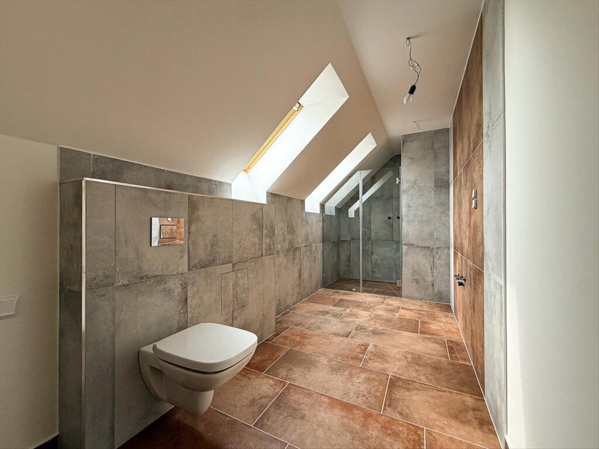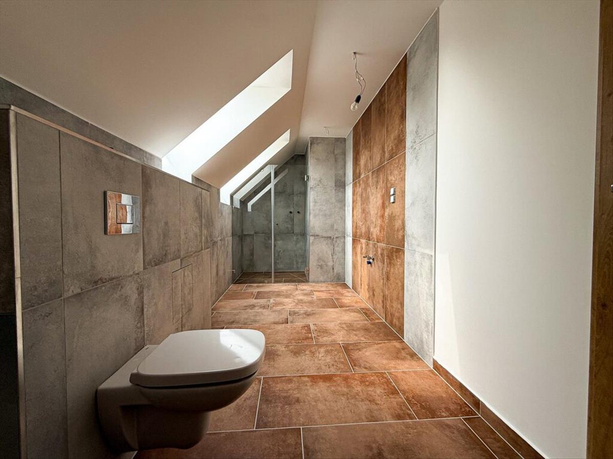 Az emeleten két további hálószoba (14, 60 m² és 16, 74 m²) várja a család tagjait, mindkettő kényelmes méretű, jól szellőztethető, velux tetőablakokkal kiegészítve. a 9, 06 m²-es fürdőszoba modern, ipari stílusú burkolattal, üveg zuhanyfülkével és tetőablakokkal lett kialakítva - a szintet teljesen önállóan használhatóvá teszi.