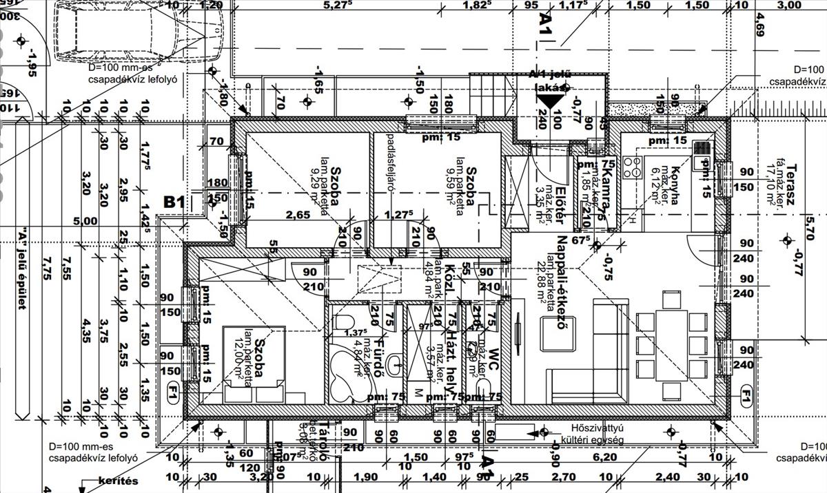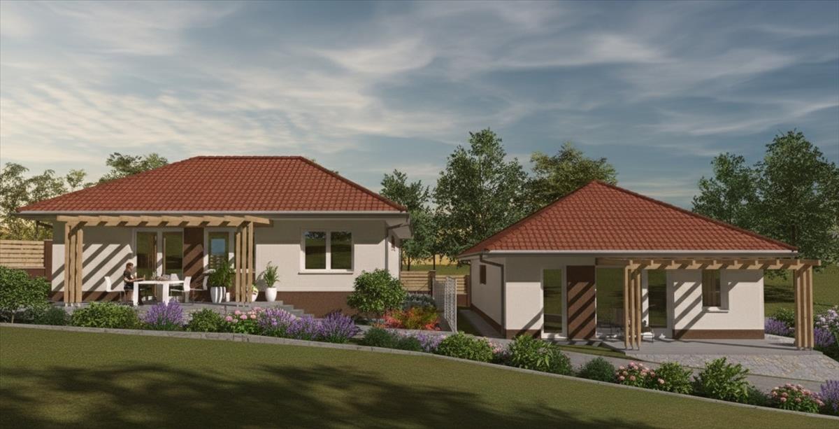 A földszintes családi ház nettó 80, 45 nm +17 nm terasz+4 nm tároló, amerikai konyhás nappali+3 hálószoba, fürdőszoba, háztartási helyiség, kamra, előszoba, külön mellékhelyiséggel épül meg.