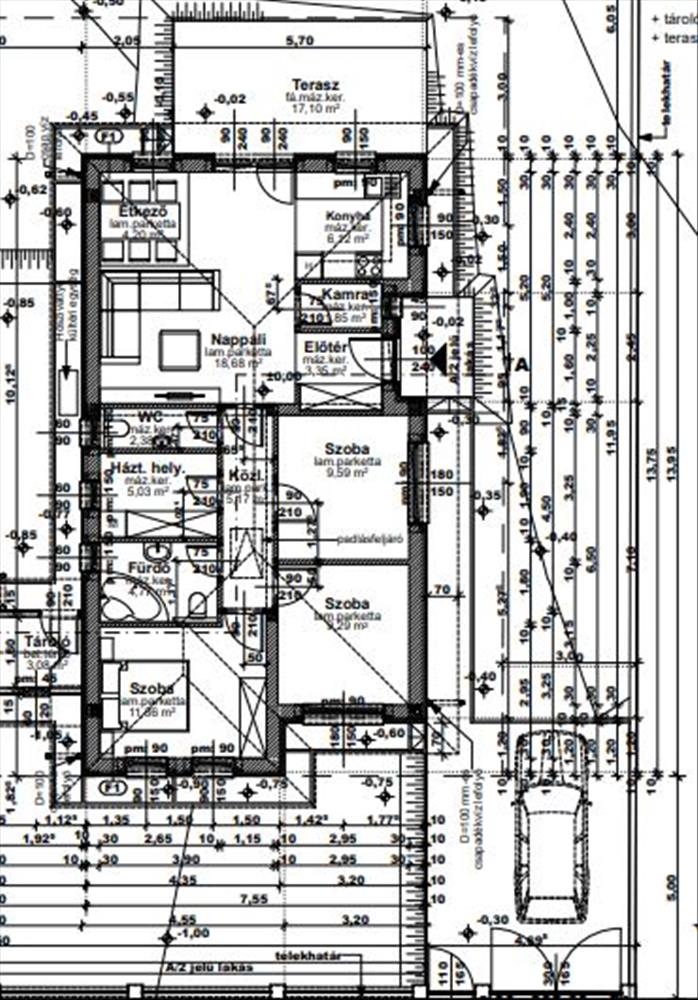 A földszintes házban található egy 29 nm -es amerikai konyhás nappali, 3 hálószoba (9, 29 nm , 9, 59 nm és 11, 86 nm ), 4, 77 nm -es kádas fürdőszoba, 3, 35 nm -es előtér, 1, 85 nm -es kamra, egy 5, 17 nm -es közlekedő, egy 5, 03 nm -es háztartási helyiség és egy 17, 10 nm -es terasz,