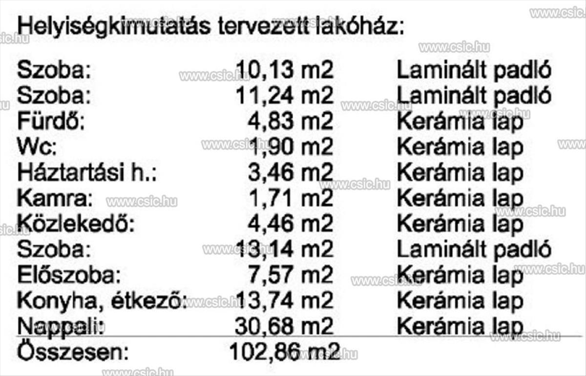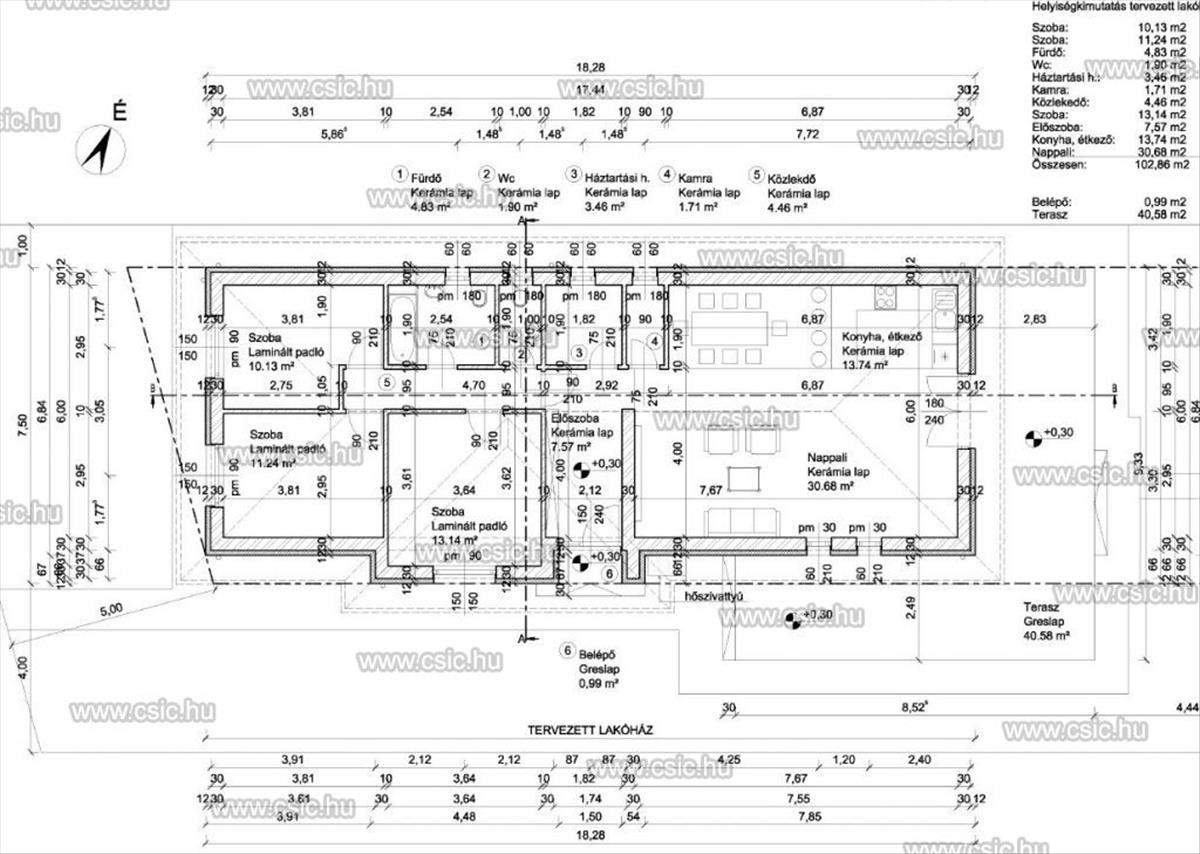 A családi ház alapterülete bruttó: 102 nm, 1+3 szobás, kert és teraszkapcsolatos 42 nm amerikai konyhás nappalival, három világos hálószobával, egy kádas fürdőszobával, külön wc- vel, gépészeti helyiséggel, előszobával, közlekedővel és egy szép tágas terasszal rendelkezik.