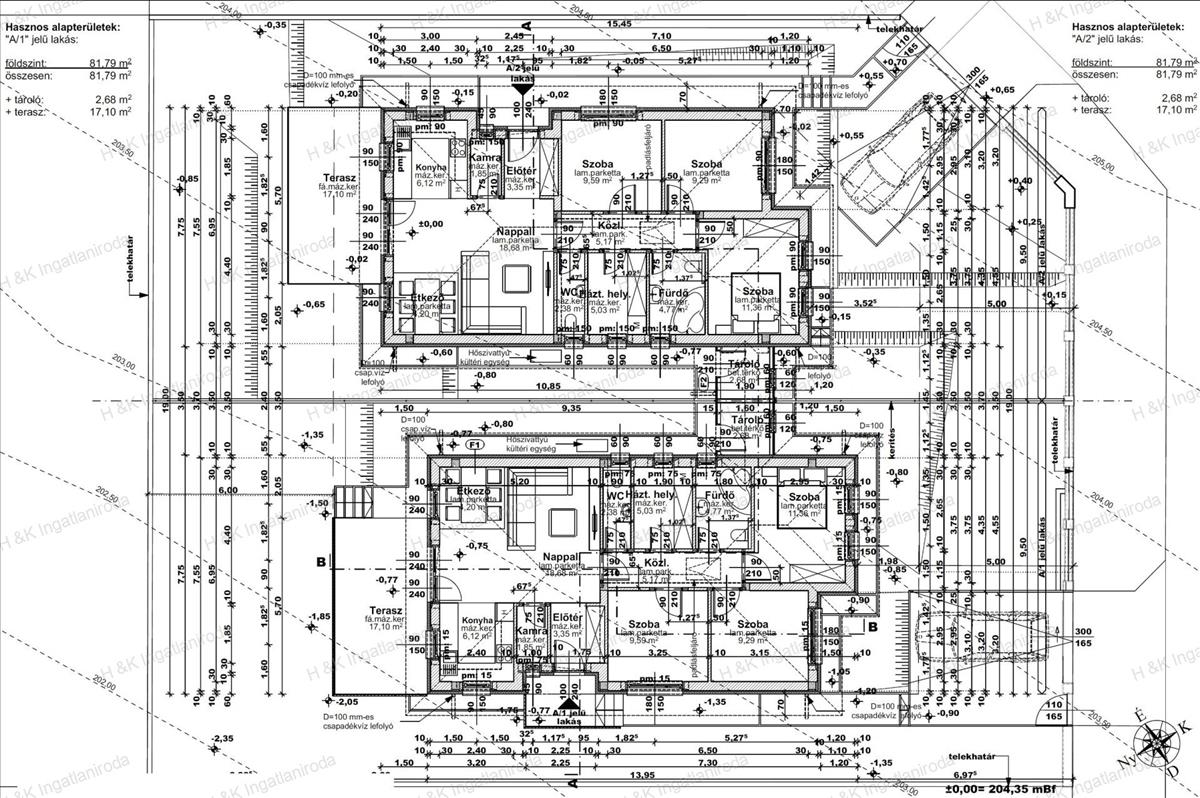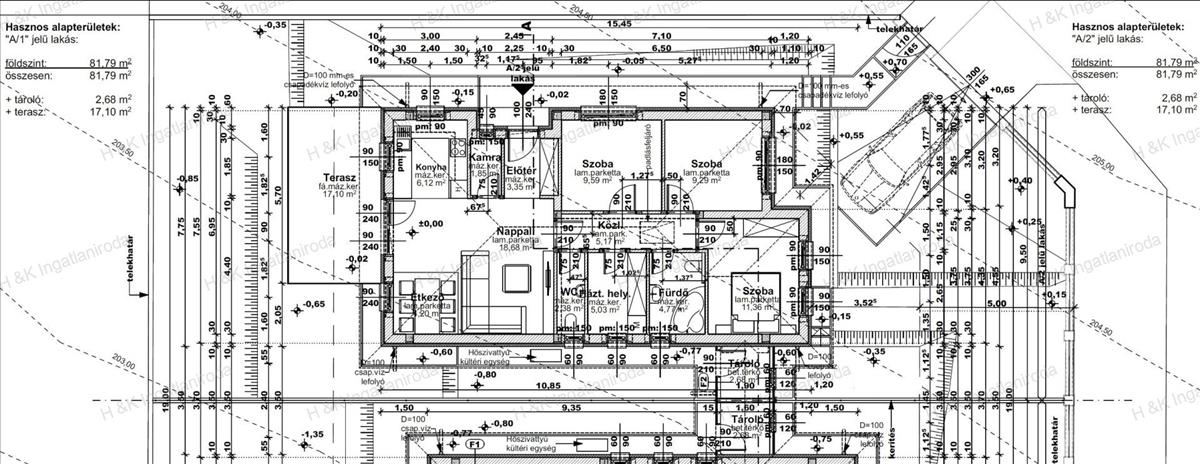 amerikai konyhás nappali (29 nm), 3 szoba (11, 36 nm, 9, 29 nm és 9, 59 nm), fürdőszoba (4. 77 Nm), háztartási helyiség (5, 03 nm), külön wc (2. 38 Nm), előtér (3. 35 Nm), kamra (1. 85 Nm), közlekedő (5, 17 nm), terasz (17, 1 nm), külső tároló (2, 68 nm)