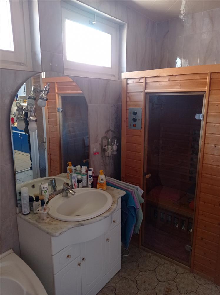 Az alsó szinten két fürdőszoba, konyha és egy hatalmas nappali kapott helyet, a fűtést egy tekintetet magára vonó cserépkályha szolgáltatja, de gázkazán, vegyes tüzelésű kazán és inverteres klímák is rendelkezésre állnak.