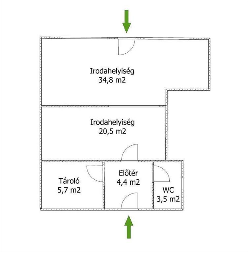 2 bejárattal rendelkezik, a házból nem átjárható, 5 helyiségből áll (tekintse meg az alaprajzot). Az irodarészként használt területet egy boltív választja el, a 34, 8 m2-es helyiségbe az utca felől nyílik ajtó, szemben vele pedig a műhelyből léphetünk be az előtérbe a másik ajtón keresztül. Rendelkezik egy wc helyiséggel, mely elég nagy ahhoz, hogy fürdőszobaként kerüljön hasznosításra. Az itteni tárolóban pihen a 2 db gázkazán: az iroda és a ház területétnek fűtéséről külön-külön gondoskodnak. Az irodarész rendkívül tágas, funkcióját tökéletesen ellátja, ügyfelek fogadására, iratok tárolására vagy akár bemutatóterem kialakítására alkalmas.