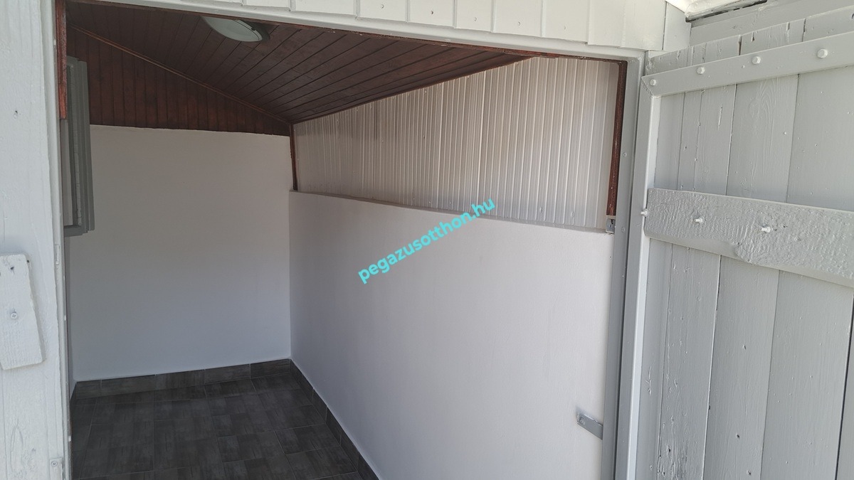 lambériázott és festett belső terek. Betonozott pihenőhely a garázs és a melléképület