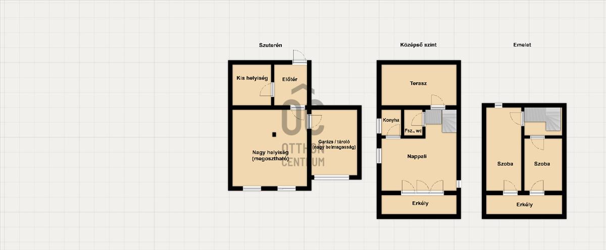 A 3 szinten összesen 4 szoba található. Az alsó szint különálló, így vállalkozásnak vagy külön lakrésznek is alkalmas. a lakószint (középső és felső) egy belső lépcsővel van összekapcsolva.