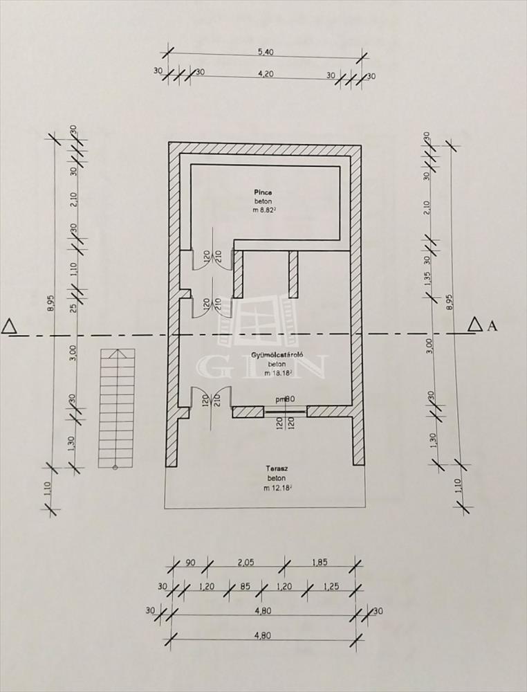 1. Szint: 27 m2 pince/tároló + 12, 18 m2 terasz