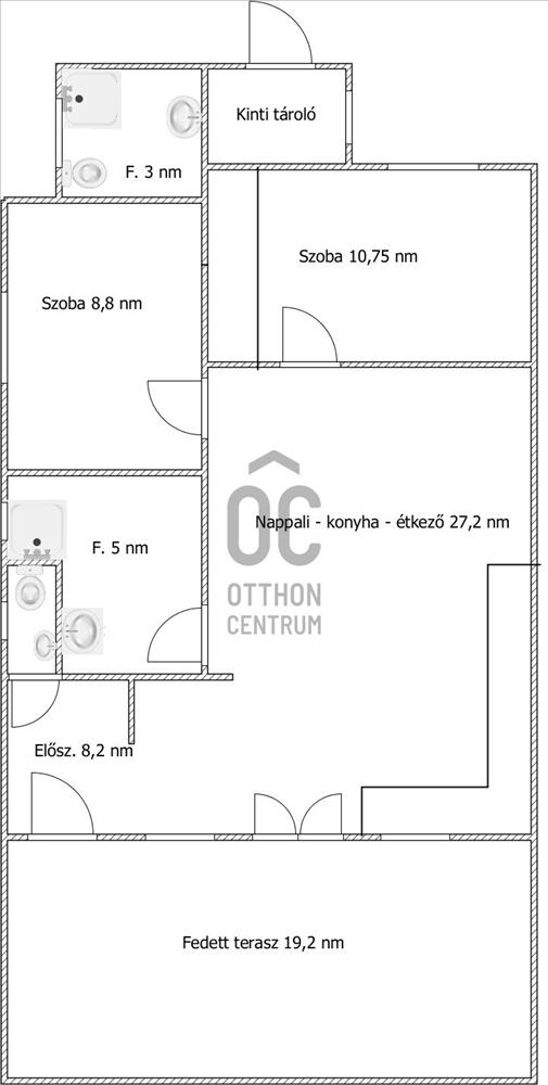 -belső elrendezése: előszoba, nagyobb közösségi tér (nappali-konyha-étkező), két hálószoba, két fürdő, külön illemhely