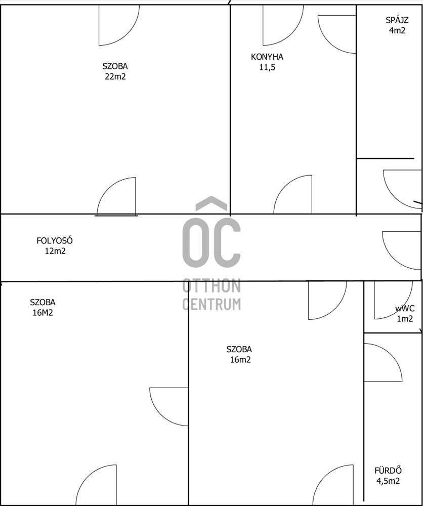 88 m2-es melyben van 3 szoba, konyha, fürdő, wc, spájz és közlekedő.