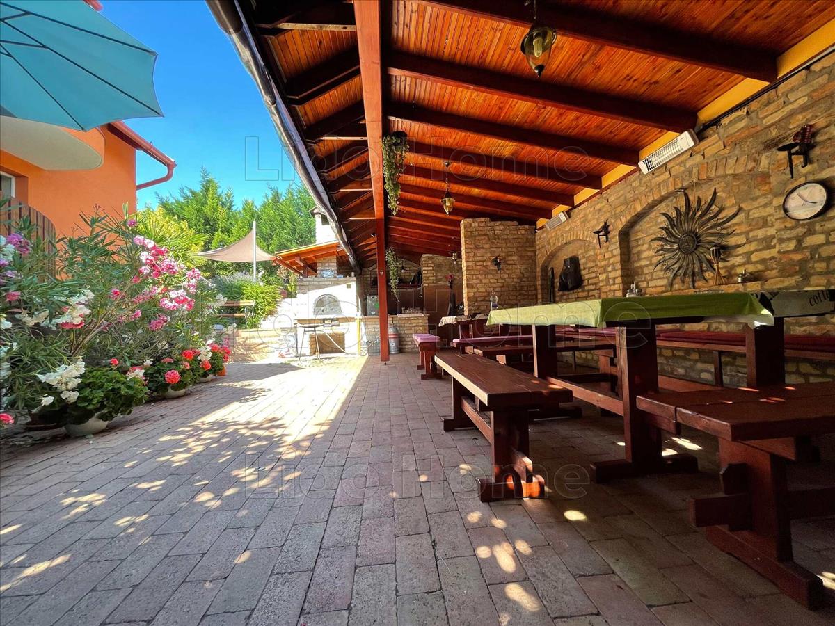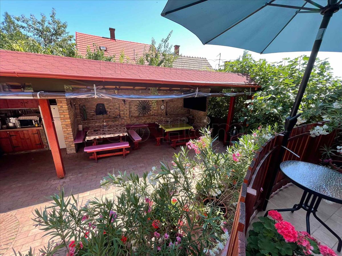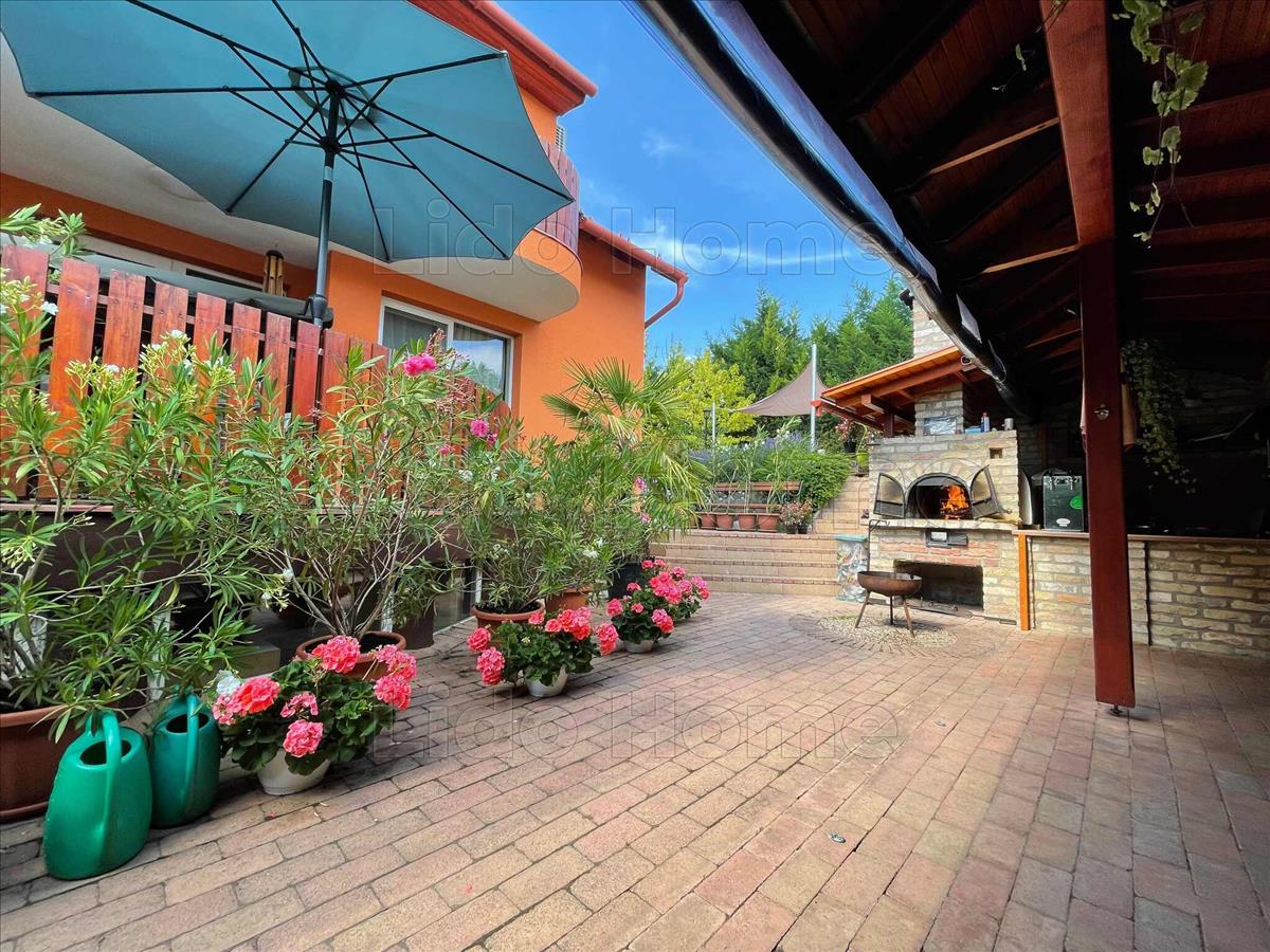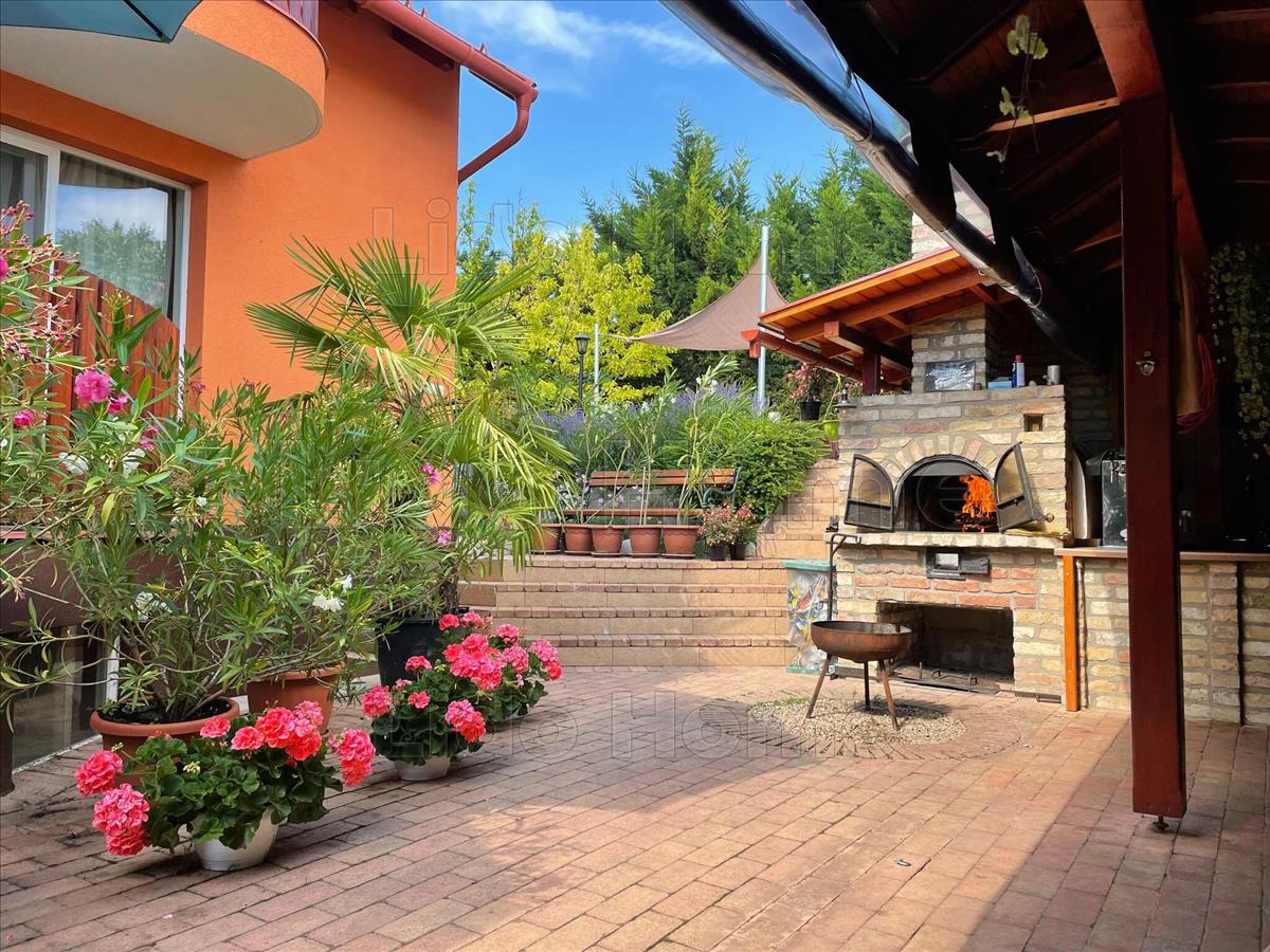 A gondozott udvaron egy közel 40 m²-es fedett terasz található nyári konyhával és épített kemencével, valamint egy hőszivattyúval fűthető medence biztosítja a kényelmet és a kikapcsolódást.