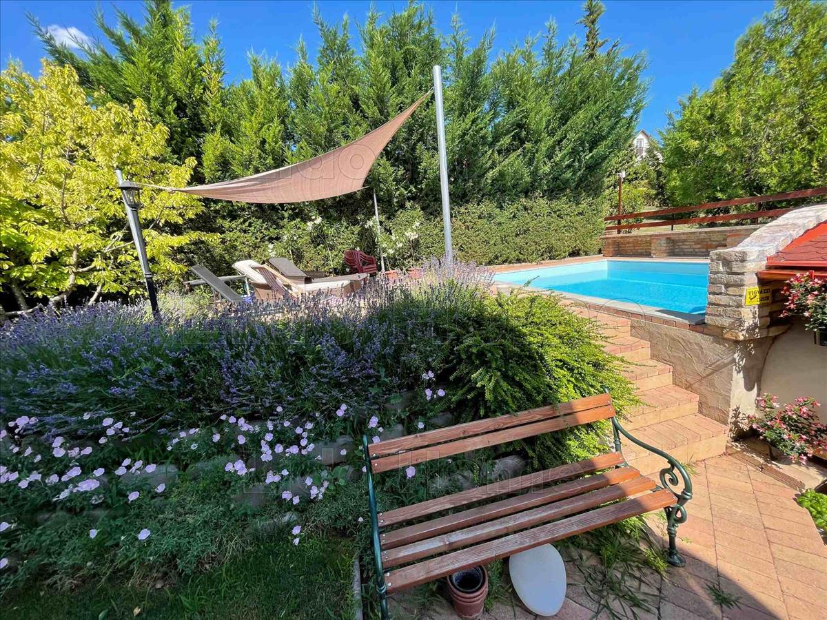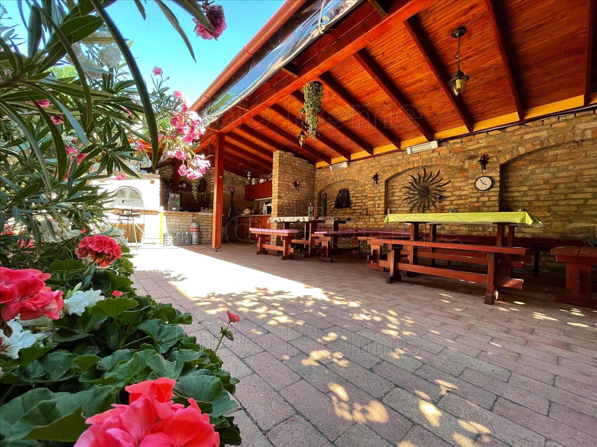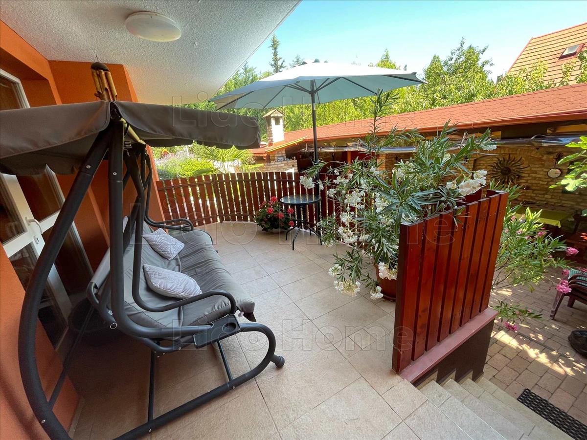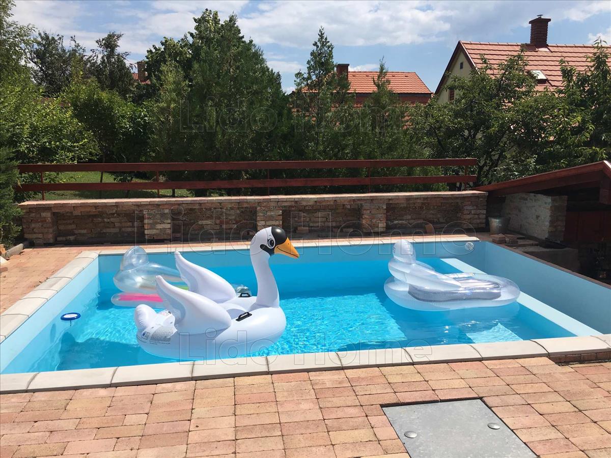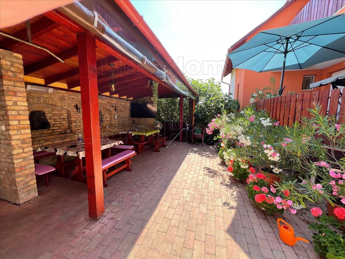 A gondozott udvaron egy közel 40 m²-es fedett terasz található nyári konyhával és épített kemencével, valamint egy hőszivattyúval fűthető medence biztosítja a kényelmet és a kikapcsolódást.