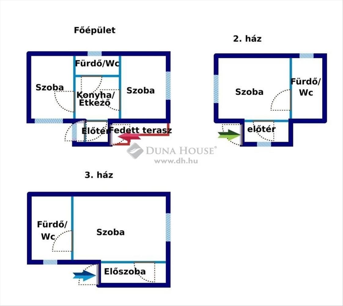 Pánd belterületén a központ közelében eladó 3 házikó - egy telken belül! Akár 3 generációnak is alkalmas! Beektetésre is kiváló, hisz 3 külön lakrész alakítható ki belőle. Az első kettő házban minden közmű bekötésre került (villany, víz, gáz, csatorna). a harmadik házat pedig jelentleg tárolóként használják - itt a víz és a villany került bekötésre. Az udvarra autóbeállási lehetőség is van! a főépület (1. Ház) 2 különbejáratú szobából, étkezős/konyhából, fürdő/mosdóból és egy előszobából áll. (44 m2) + 9 m-2-es fedett terasz is tartozik hozzá). a második épület (18 m2) Egy szobából, fürdő/wc-ből és egy előszobából áll. a harmadik épület (20 m2) tárolóként funkcionál - de ott is egy szoba, előszoba és egy fürdő/mosdó helyiség lett kialakítva. Az ingatlanok lakható állapotban - de felújításra szorulnak. Jelenleg albérlők lakják a házat, így a birtokbaadás 60 nap. Közelben: iskola, művelődési ház, posta, Abc, óvoda, buszmegálló stb.
