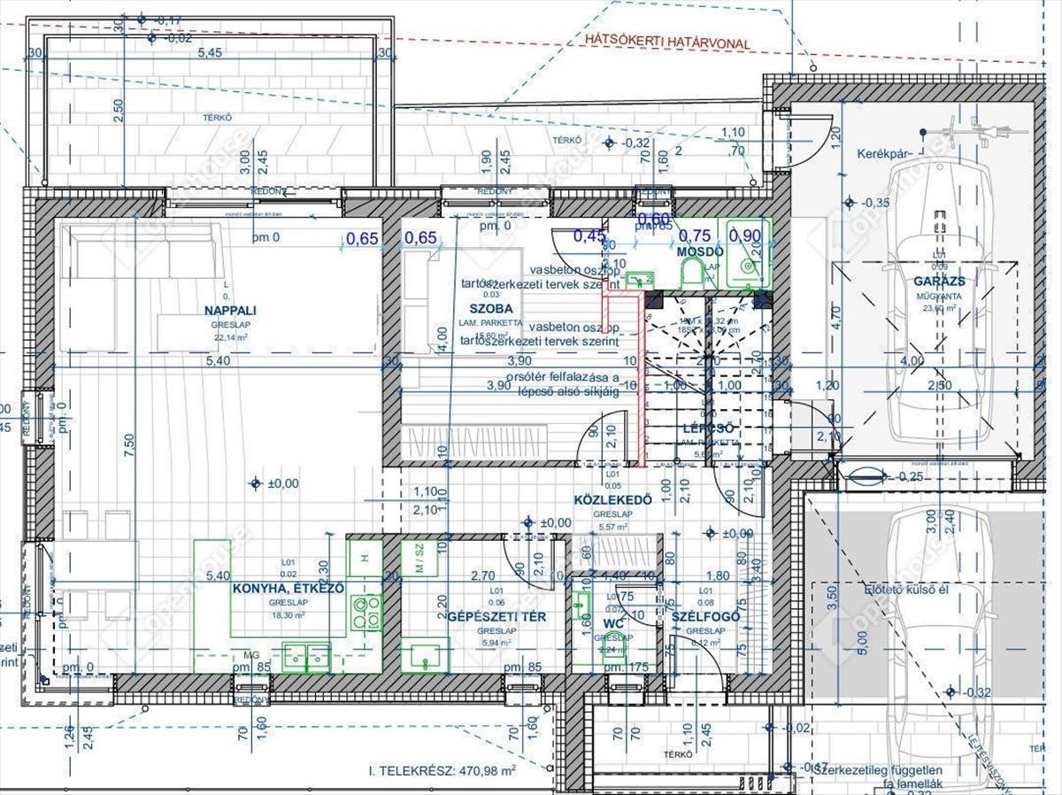 - elektromos kapuval ellátott garázzsal + 1 autóbeállóval,