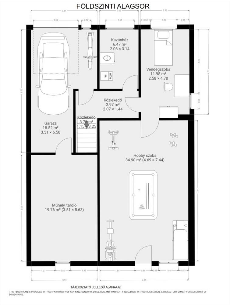 Itt helyezkedik el a garázs, a kazánház és mosókonyha, egy vendégszoba, valamint tároló helyiségek, amikben akár konditermet, műhelyt, hobbiszobát lehet kialakítani, vagy vakár üzleti tevékenység folytatására is alkalmas.