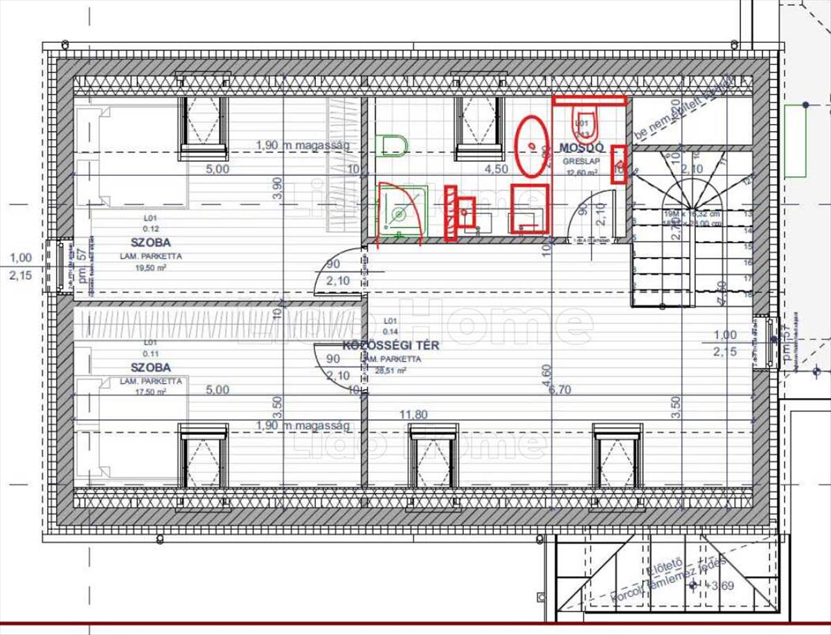 -Földszint: szélfogó, amerikai konyhás nappali étkezővel, közlekedő, dolgozószoba, fürdőszoba, wc, kazánház