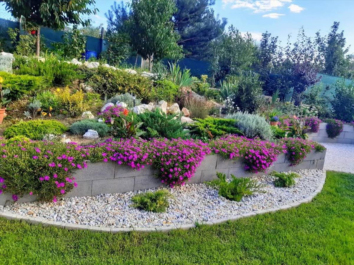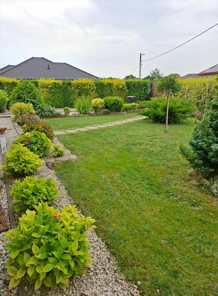 980 M²-es parkosított kert termő gyümölcsfákkal.