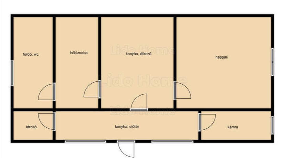 - helyiségek: 2 szoba, étkező, konyha, fürdőszoba, előtér, kamra, tároló