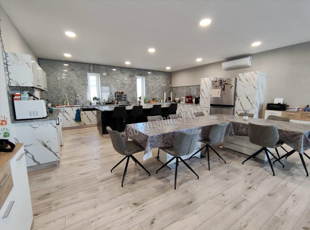 Sürgősen eladó! ! ! Pápa város csendes zsákutcájában egy 360 m2 bruttó/ 240 m2 nettó alapterületű, két lakrészt magába foglaló, bb energetikai besorolású, új építésű családi házat, amely 7124 m2 térmértékű telken helyezkedik el.Az ingatlant 2022. Márciusában kapott használatbavételi engedélyt.