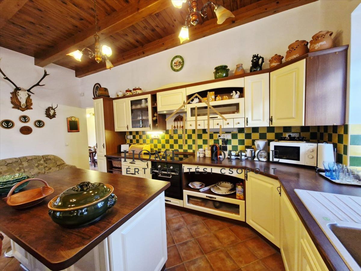 A konyha teljesen gépesített, praktikus elrendezésű egy nagy konyhaszigettel.