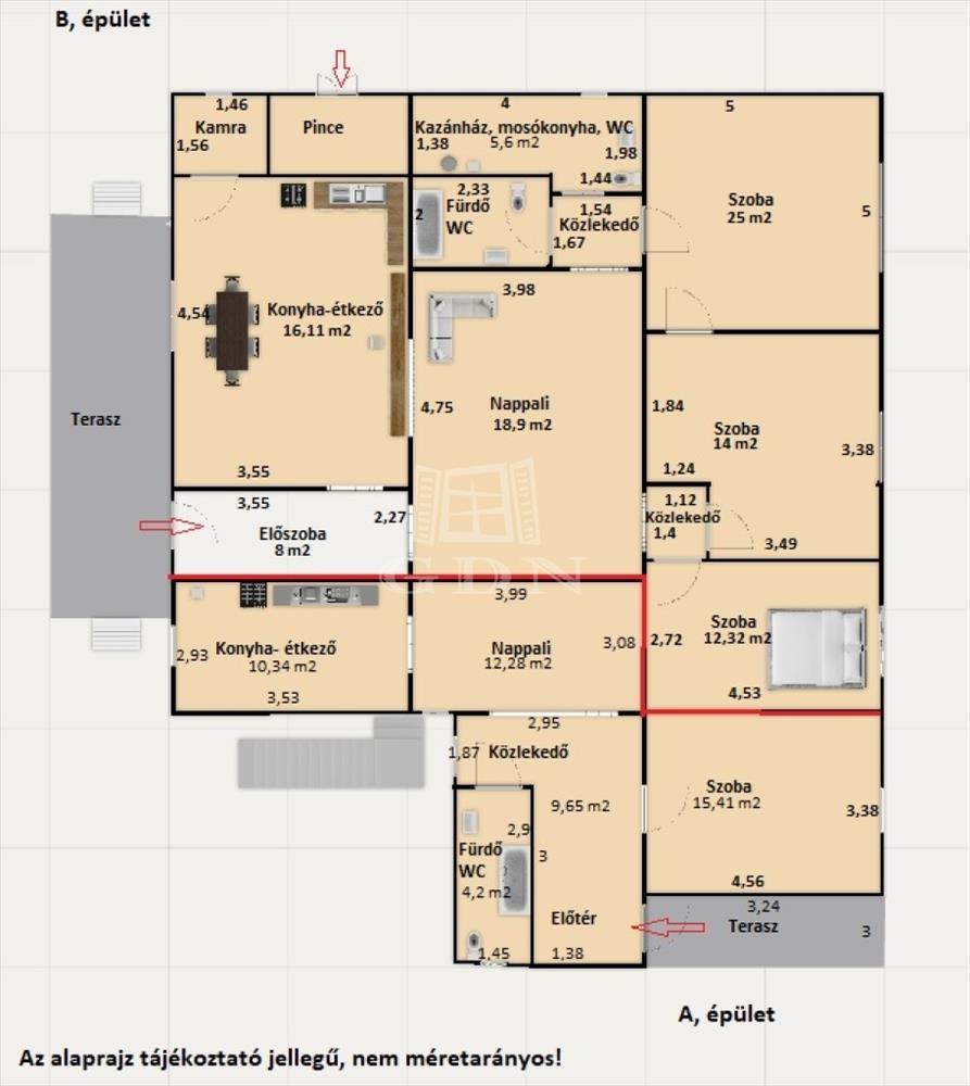 A földszinten lévő lakószint, nappali + 3 hálószoba, nettó 111, 12 m². Az emeleti külső lépcsős, külön bejárattal és külön közműórákkal rendelkező lakás, nappali +3 félszoba, nettó 71, 98 m².