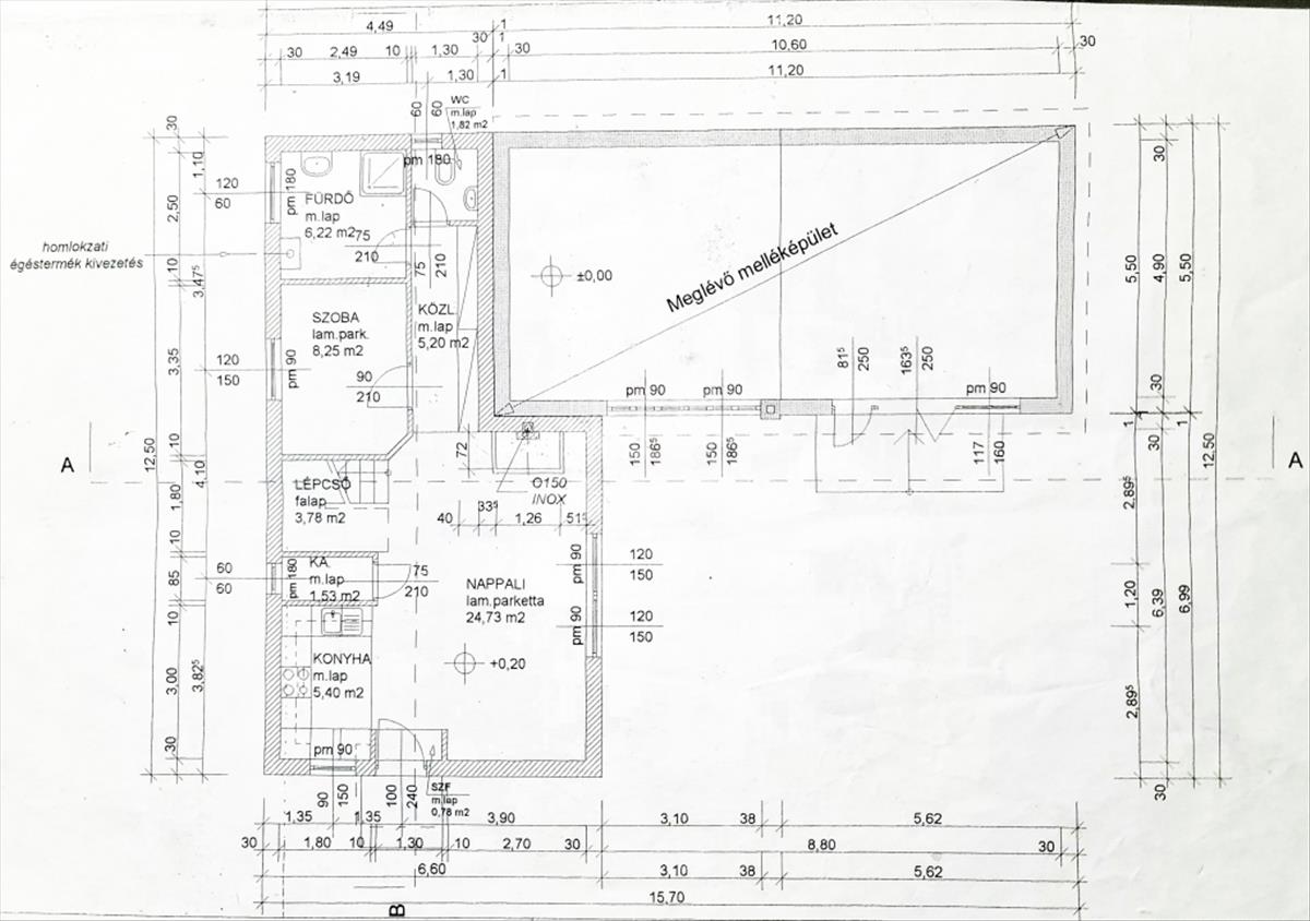 A régebbi épület 3 szintes, 1983-ban épült, beton alapra épült, 40 cm-es tégla falazattal, beton födémmel, pala tetővel és fa thermo nyílászárókkal. Ingatlan részben jó állapotú, részben felújítandó, a telek utcához közelebb eső részén helyezkedik el. Az egész épület alatt pince szint van, ahol a kazánház és táróló található. a földszinten, illetve az emeleten, egy-egy külön bejáratú lakás áll rendelkezésünkre, mind két lakásban van külön fürdőszoba, konyha, étkező, nappali és szobák is.
