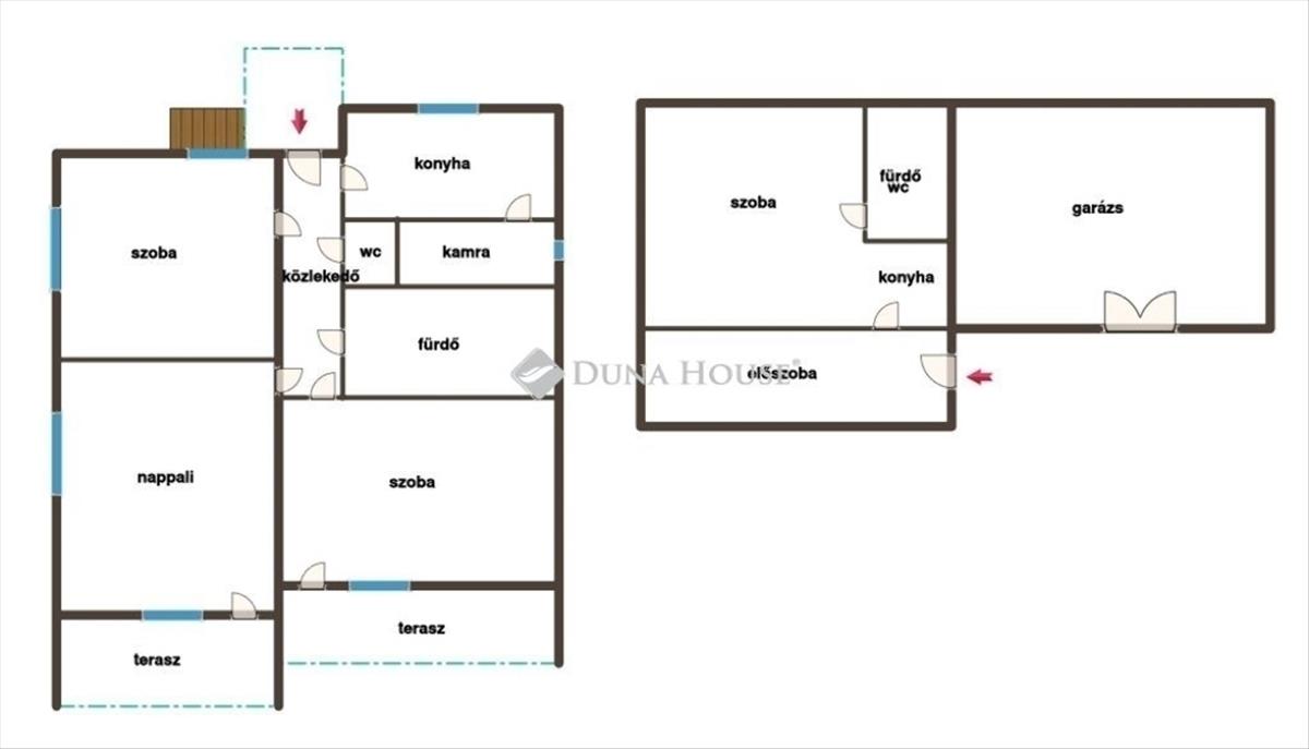 A telekkel szemben állva a jobb oldalon helyezkedik el a nagyobb épület amit jelenleg nem használnak. Az épülethez egy lépcső vezet el minket, amely után belépve az ingatlanba egy közlekedőt találunk, balra van egy konyha, kamra és jobbra egy szoba a közlekedőn tovább haladva balra van a wc, mellette a fürdőszoba kapott helyet ha jobbra tovább megyünk egy nappalit találunk ahonnan egy lépcsőn fejutunk a tetőtérre ami beépíthető. Az ingatlanban tovább van még egy szoba és egy beépített terasz is. Fűtésük egyedileg megoldott.