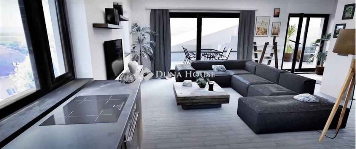 A ház egyediségét a domborzati viszonyok előnyeinek teljes-körű kiaknázása adja. a dombtetőn álló ház legfelső emeletének hatalmas teraszáról és amerikai konyhás nappalijából panoráma nyílik Budapest környékének domborzatára. Ezen a szinten mosdó és wc is rendelkezésre áll.