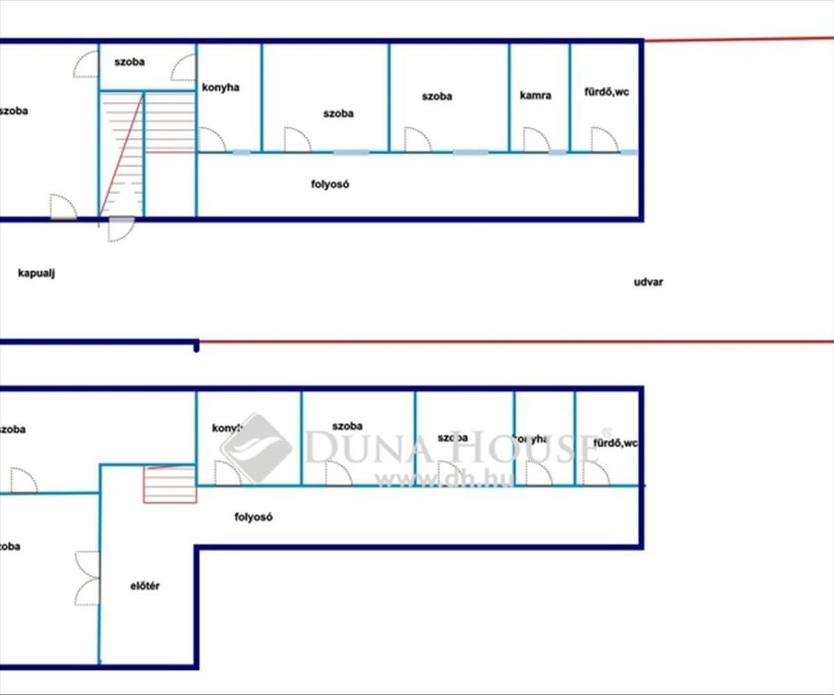 Jelenleg 4 lakásos 9 szobával közös udvarral, pincével, padlással.