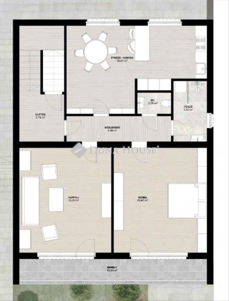 Tágas, világos otthoni élettér prémium burkolatokkal, egyedileg gyártott bútorokkal, előszoba, 2szoba, étkező-konyha, fürdő, wc, és egy 12 m²-es terasszal, ahonnan gyönyörű panoráma nyílik a környékre.