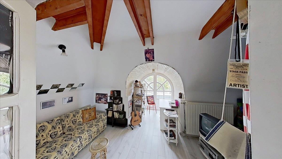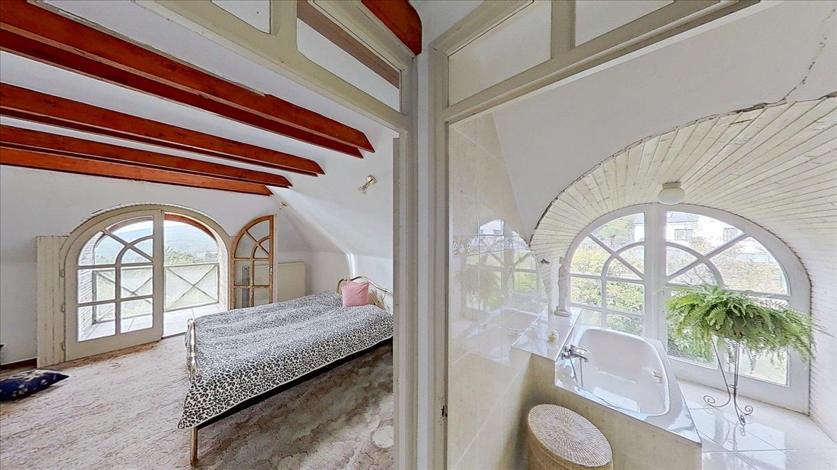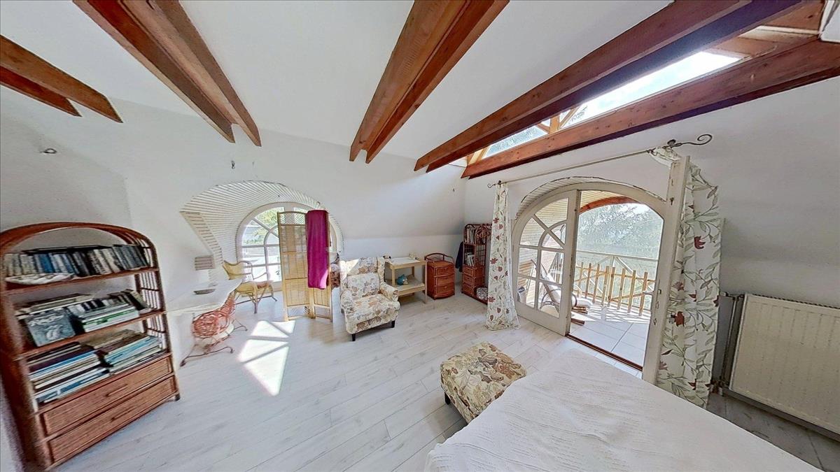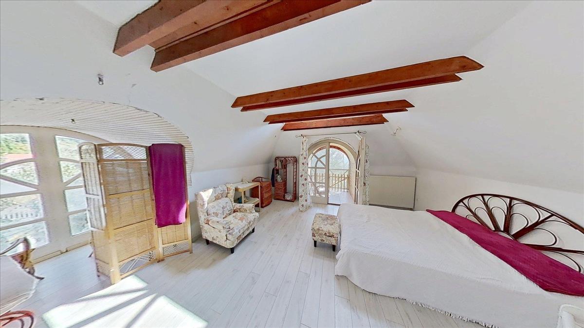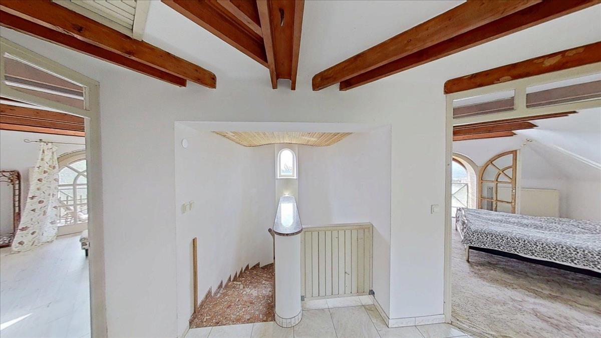 Az emeleti szinten három hálószoba (22, 25 és 14 m²), valamint egy 7 m²-es fürdőszoba található. a szobáknak egészen egyedi hangulatot adnak a zárt erkélyek, melyeken át lenyűgöző panoráma nyílik dél felé, a völgyben elterülő Pécs városára és a Nyugat-Mecsek vonulataira.