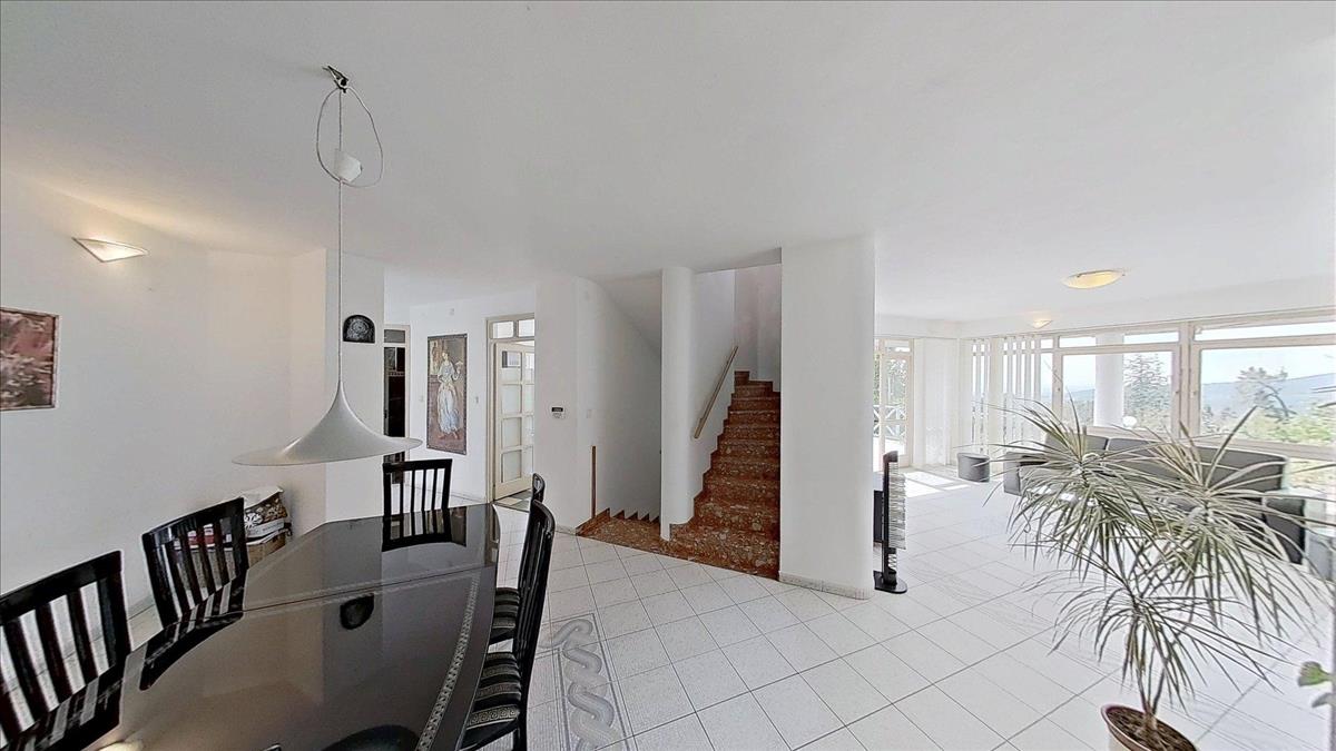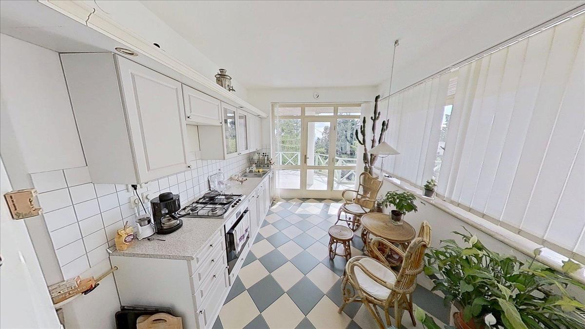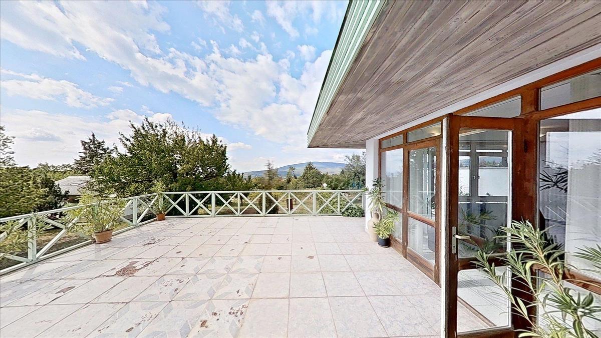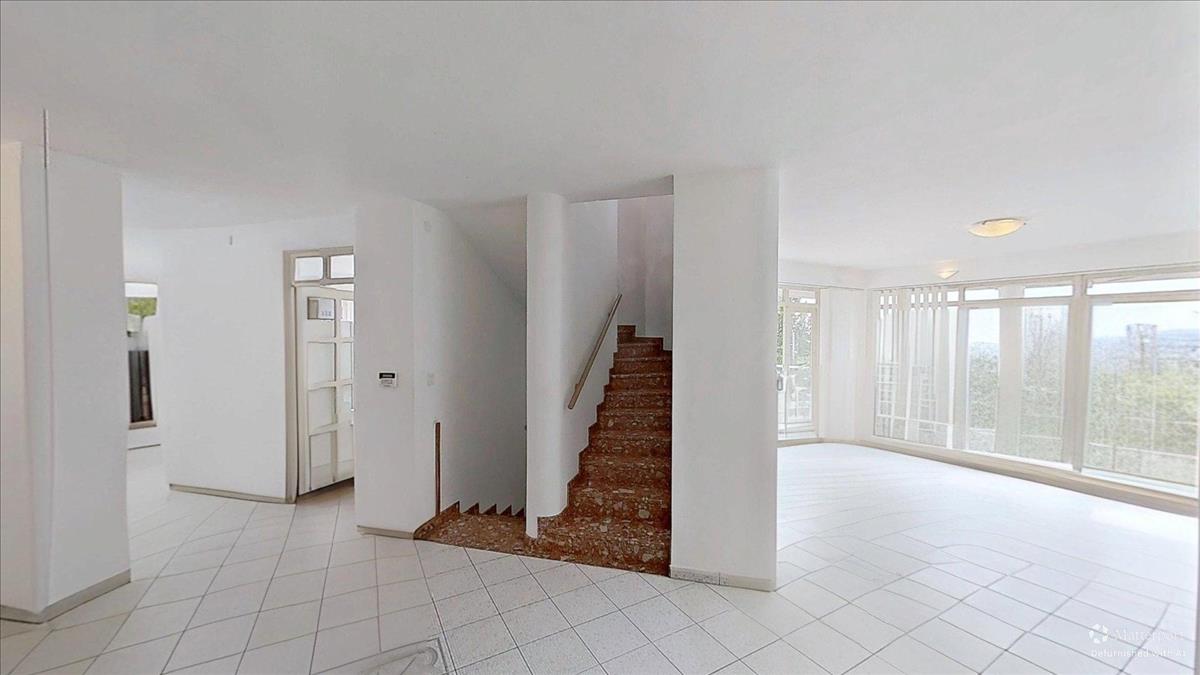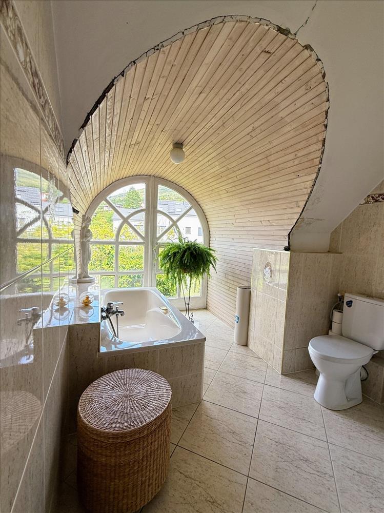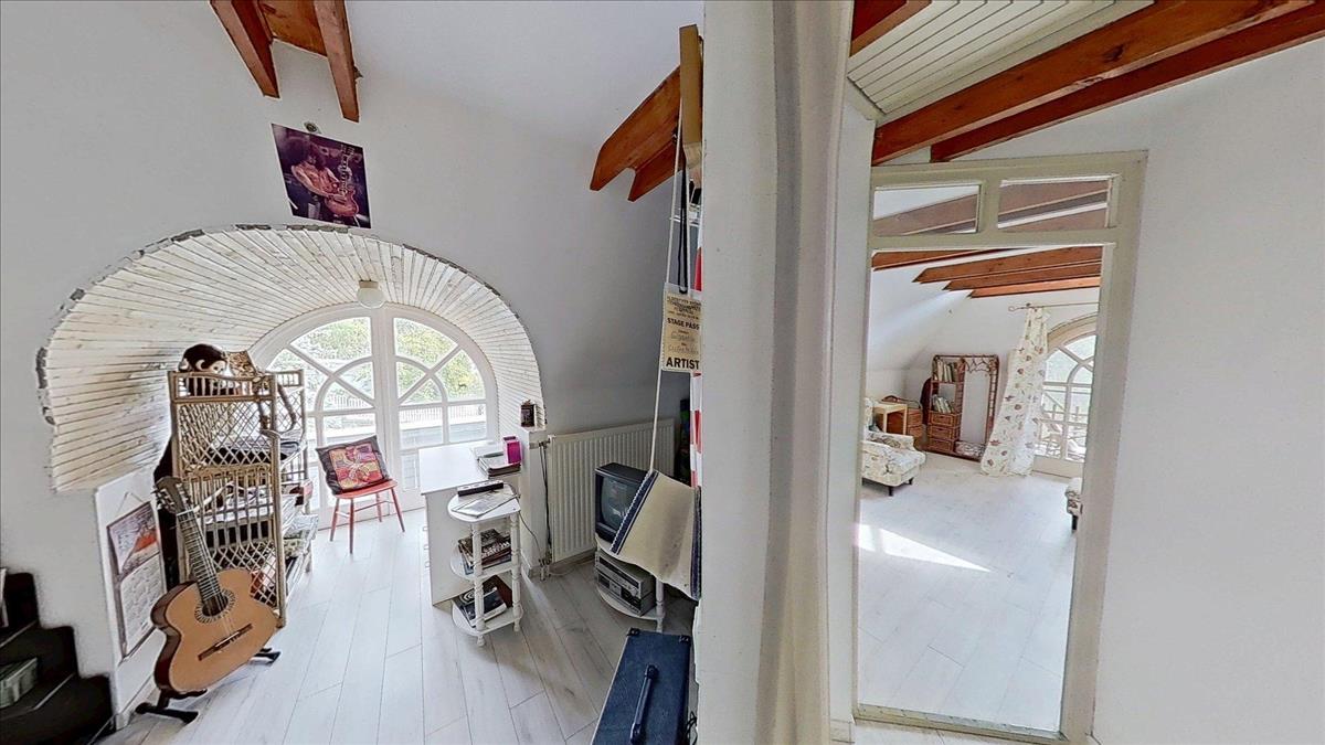Az emeleti szinten három hálószoba (22, 25 és 14 m²), valamint egy 7 m²-es fürdőszoba található. a szobáknak egészen egyedi hangulatot adnak a zárt erkélyek, melyeken át lenyűgöző panoráma nyílik dél felé, a völgyben elterülő Pécs városára és a Nyugat-Mecsek vonulataira.