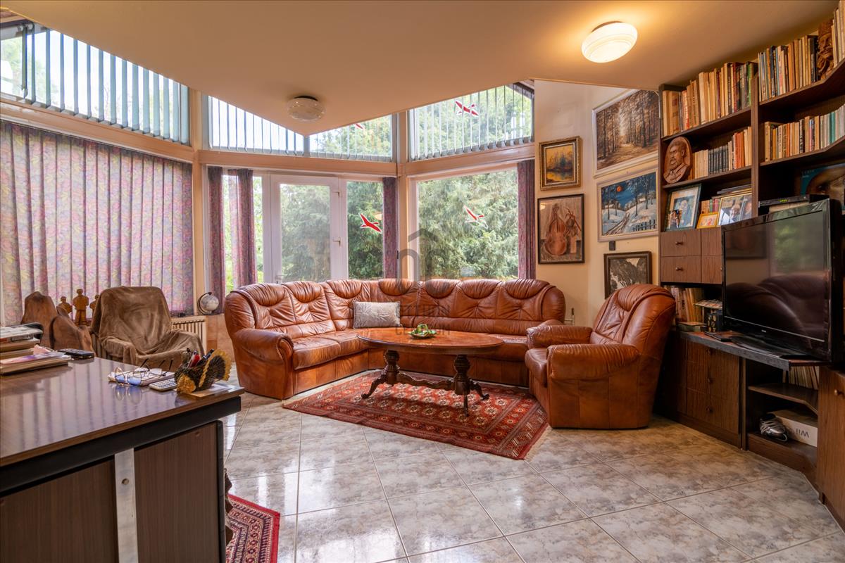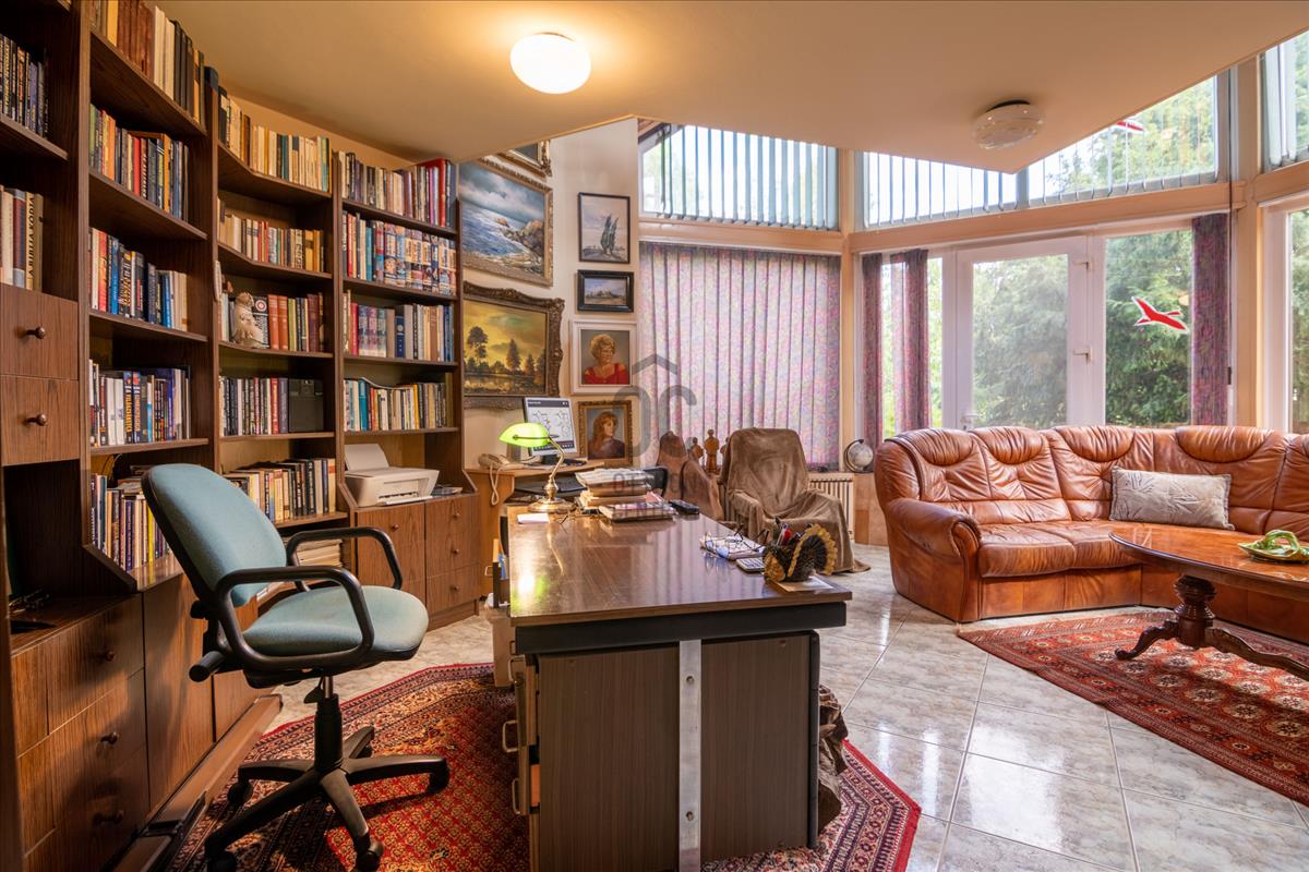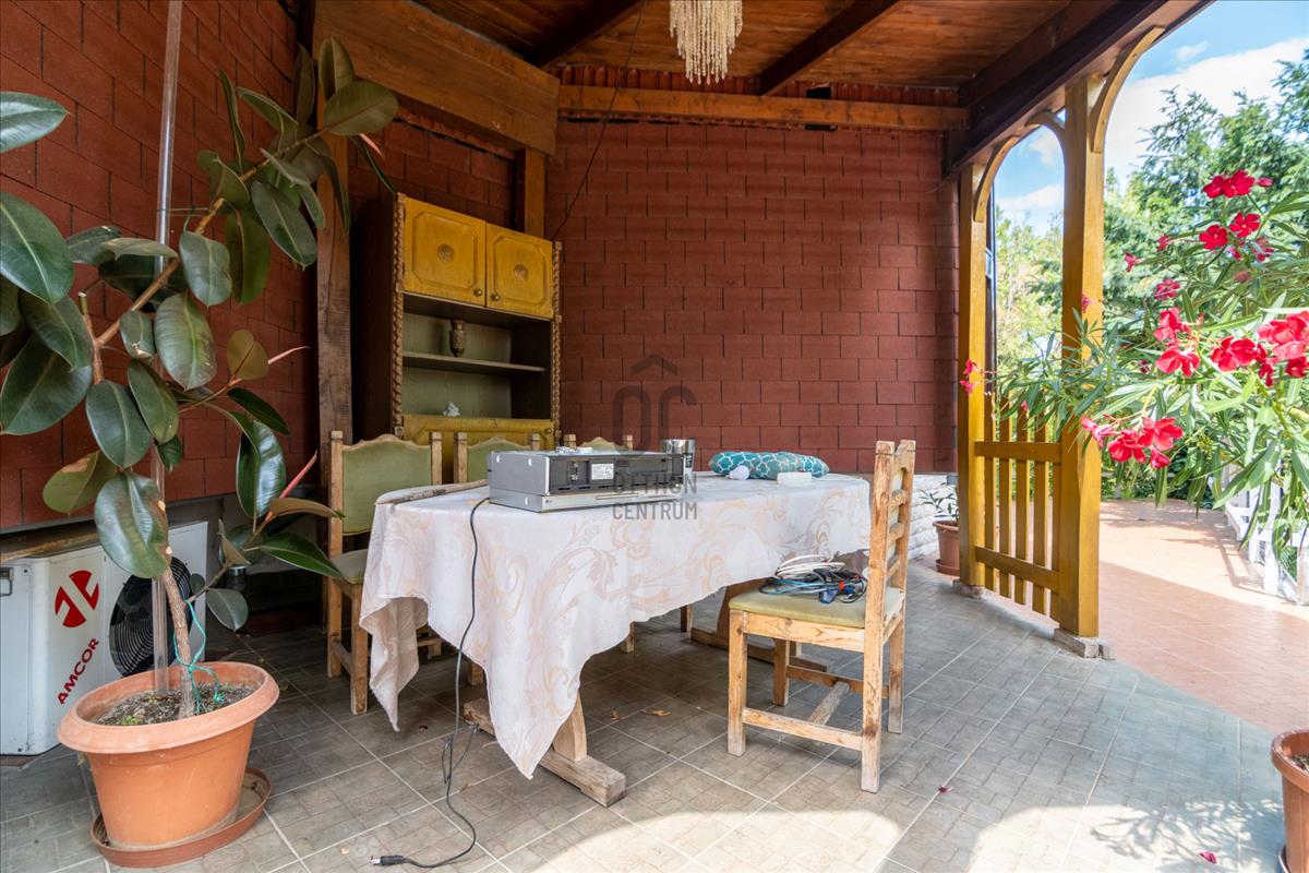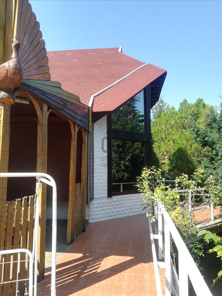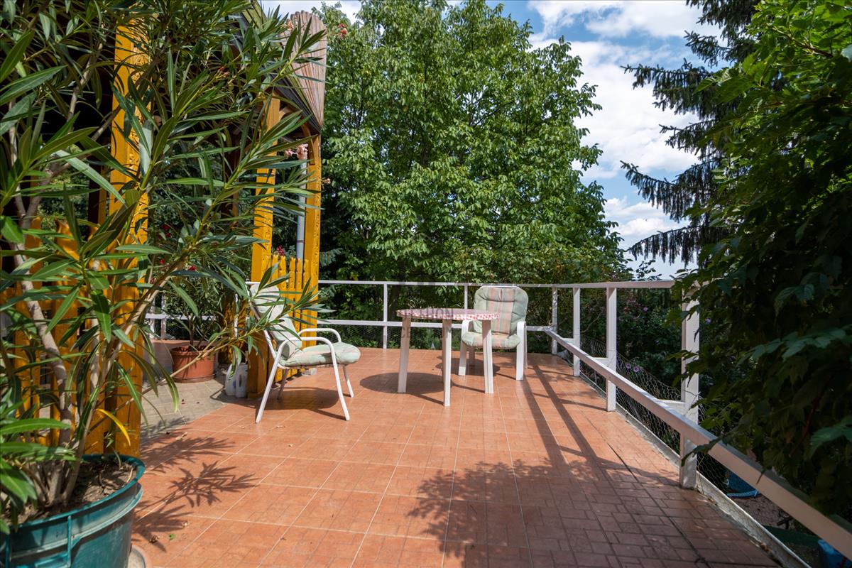 A ház kellemes klímáját az évtizedes fák, és a kert növényei biztosítják. a házat körülölelő erkélyről csodás panoráma nyílik a városra, és a Mecsek lankáira.