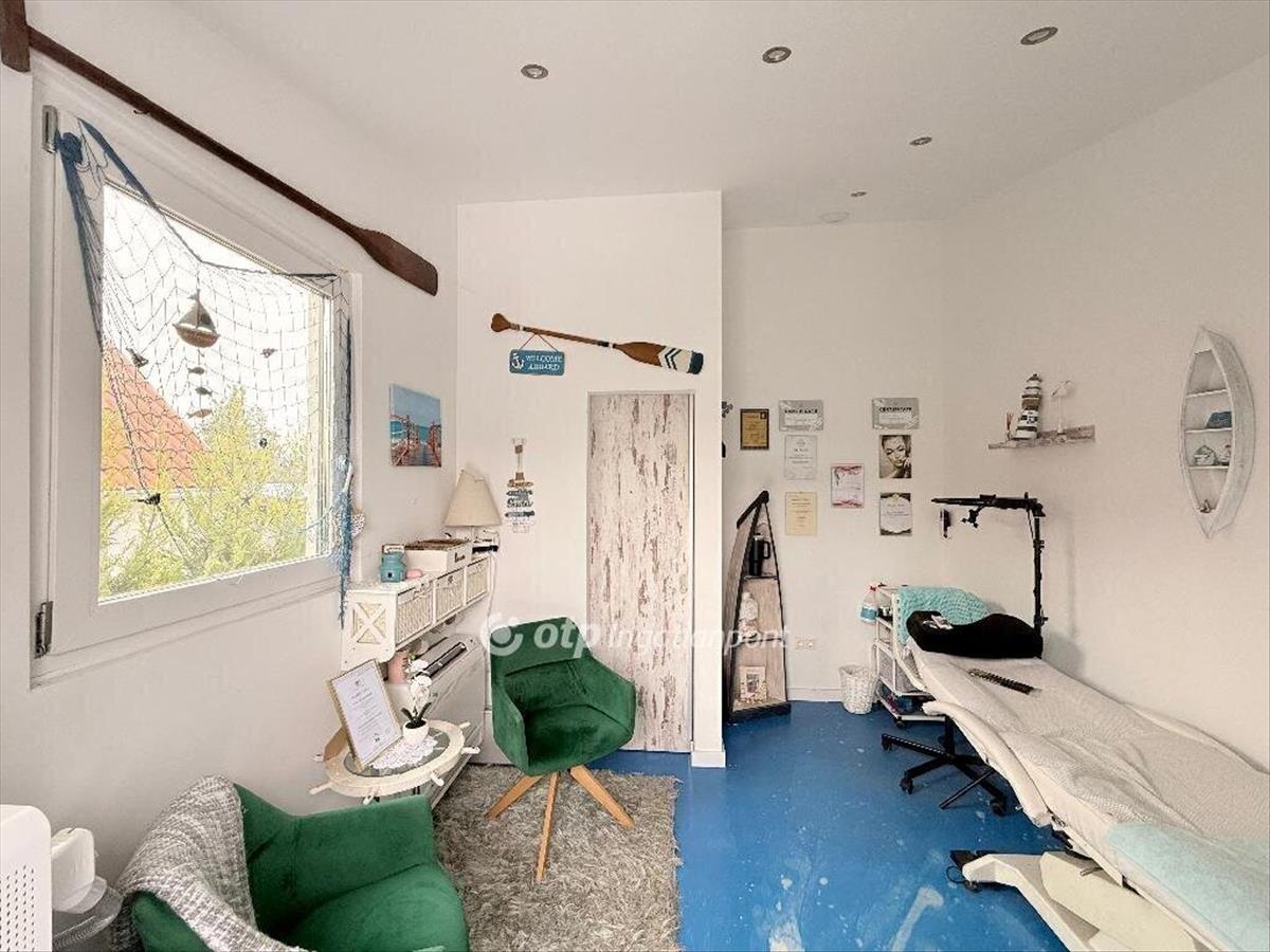 Az ingatlanhoz tartozik egy két autó számára kialakított garázs, valamint egy külön irodahelyiség, amely ideális lehet otthoni munkavégzéshez vagy vállalkozási célra is.