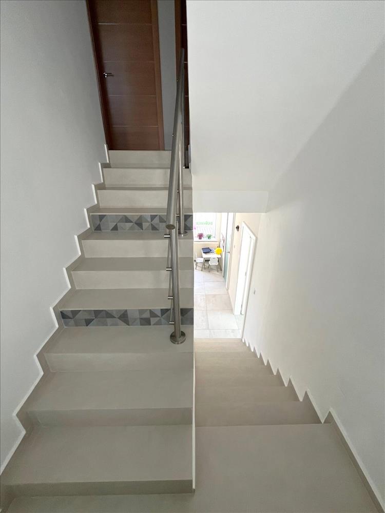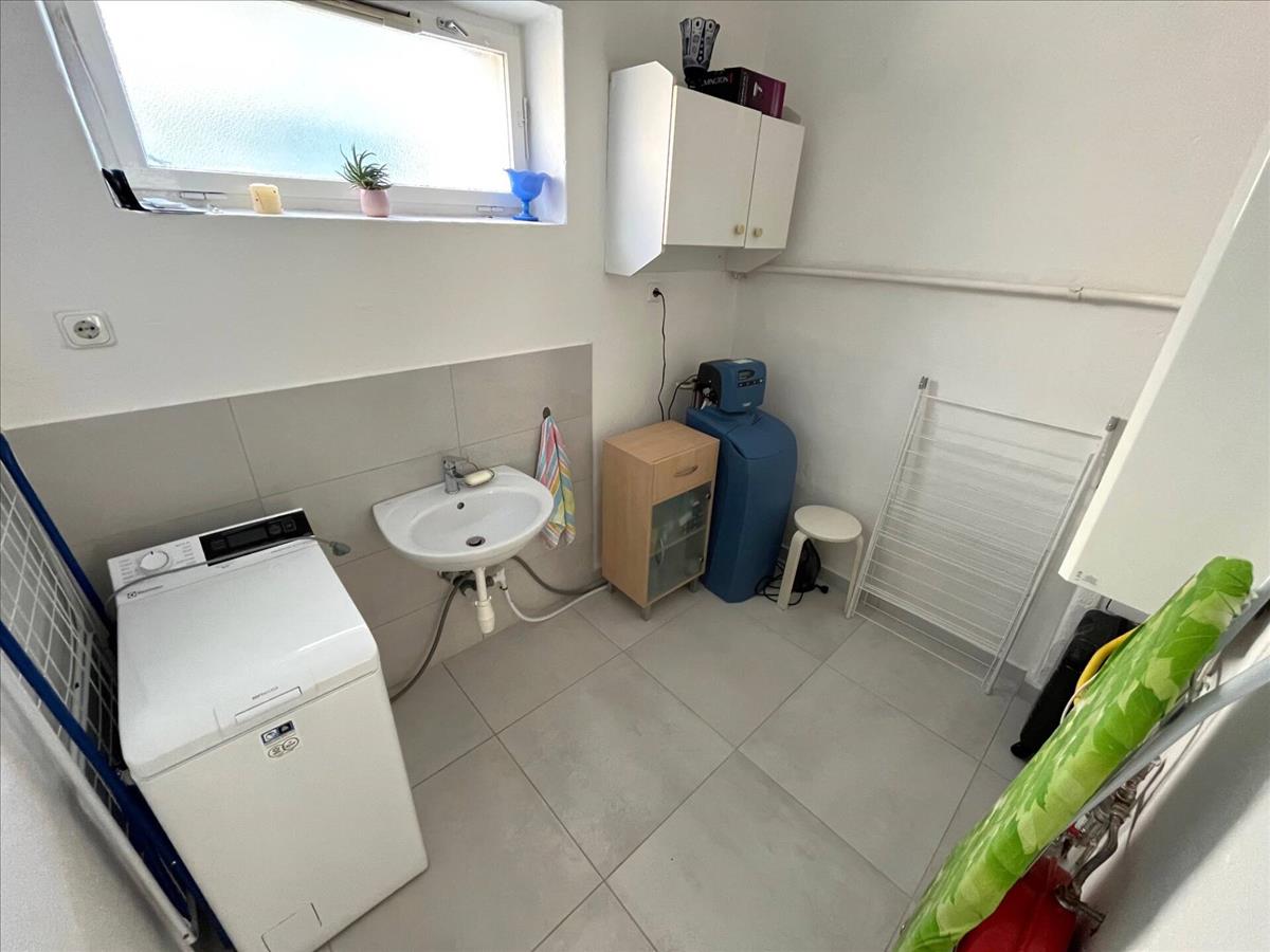 A lakótér 132 nm, két szint, az alsó szinten található előtér, étkező/társalgó, konyha, háztartási helyiség, külön wc, a felső szinten nappali, 3 hálószoba, fürdőszoba-wc, erkély.