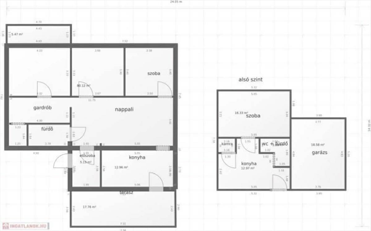 •Az alsó szinten egy szoba, konyha, fürdőszoba, mellékhelység, kamra található