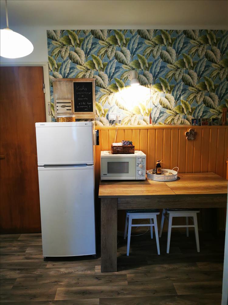 A földszinten egy hálószoba van és egy kis nappali (utólag beépített, könnyűszerkezetes, szigetelése folyamatban), konyha, fürdőszoba tusolóval, kis előszoba. a háló fűtése gázkonvektoros, a fürdőszobáé elektromos padlófűtés, a kis nappaliban elektromos olajradiátor van, a konyhában kisméretű, üveges fémkandalló is van, fafűtéshez. a melegvíz gázbojleres.