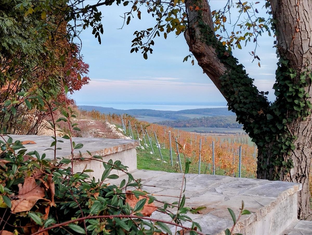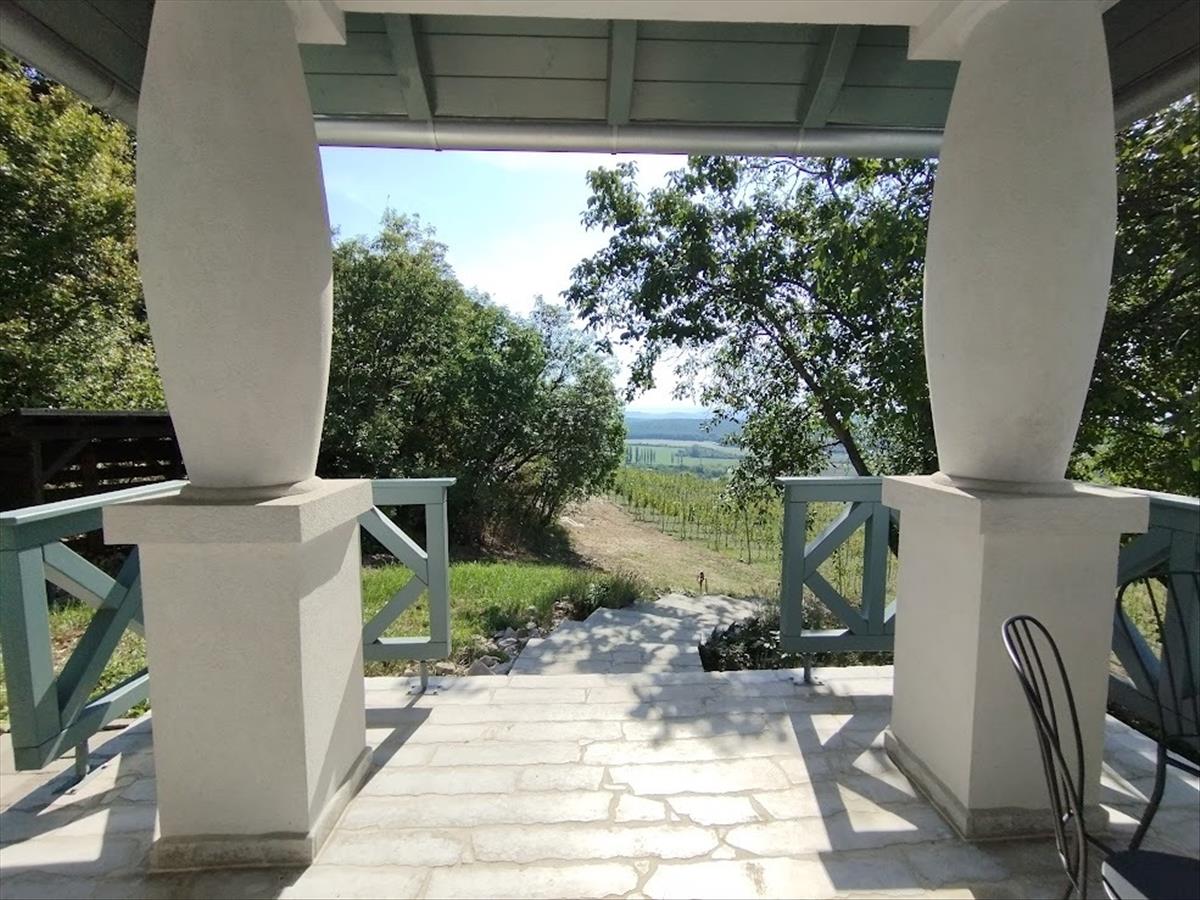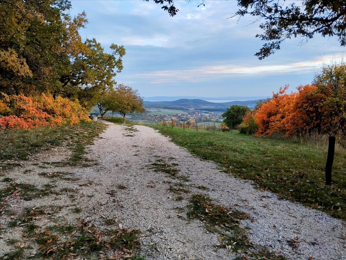 1 Km-es, kocsival könnyedén megközelíthető, zsákutcába torkolló erdei úton haladva közelíthetjük meg ezt a páratlan csodát, mely garantálja, hogy a csend harmóniáját csak a helyi erdő élőlényei törik meg a későbbiekben. a panorámateraszon állva 7800 m2-en a Biokontroll által mínősített "bio" csemegeszőlő (Cabarnet), mint egy tájra borított szőnyeg tárul a szemünk elé, távolabb tekintve pedig a Balaton több ponton is látszik.
