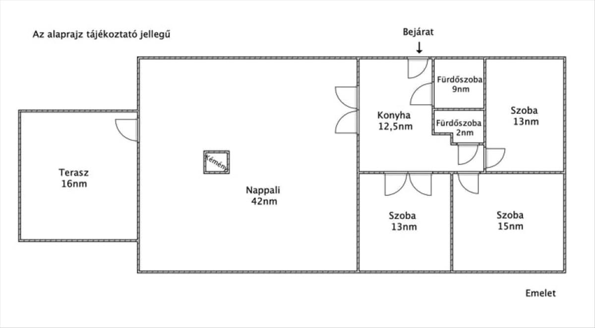 - Nappali (42 m2), 3 hálószoba, 2 fürdőszoba, konyha-étkező (12 m2), terasz (16 m2)
