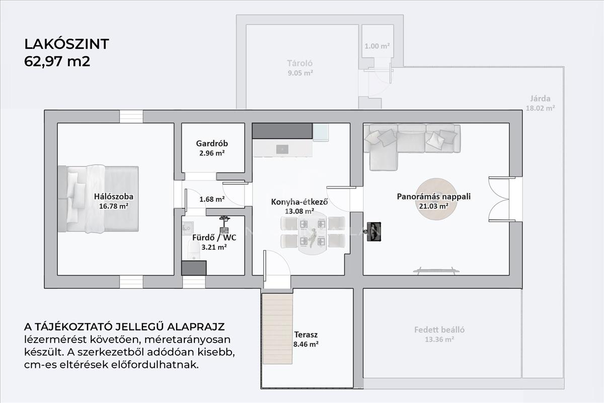 - a ~ 66 m2-es fő lakórészbe ~ 8 m2-es teraszról érünk be. Ezen a szinten 13, 08 m2-es konyha-étkező, 21, 03 m2-es panorámás nappali, 16, 78 m2-es hálószoba, fürdőszoba-illemhelyiség, folyosó és gardrób található.