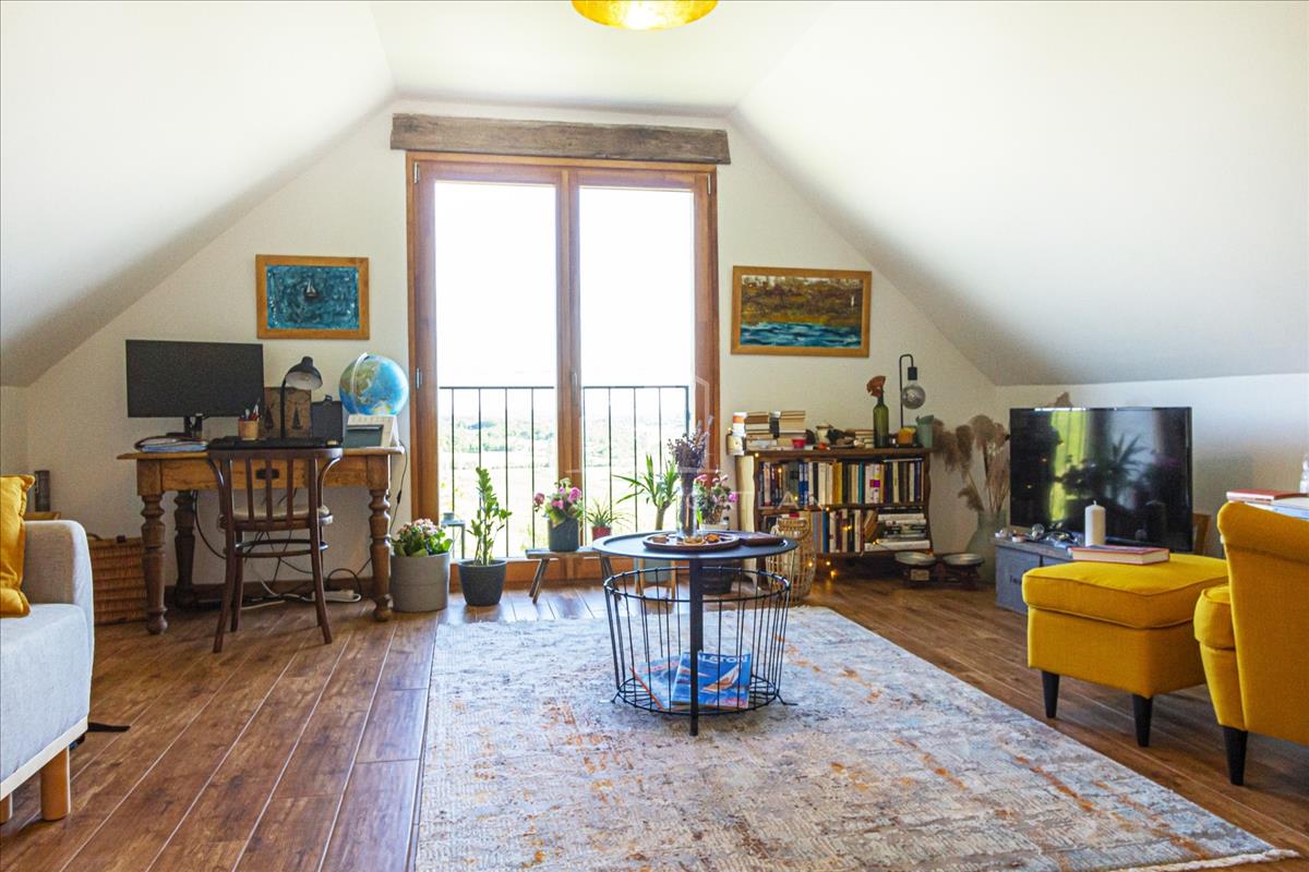 A tágas, szép nagy nyílászárókkal rendelkező, franciaerkélyes nappaliból gyönyörű kilátás tárul elénk, a napfelkelte más és más színét megmutatva minden reggel.