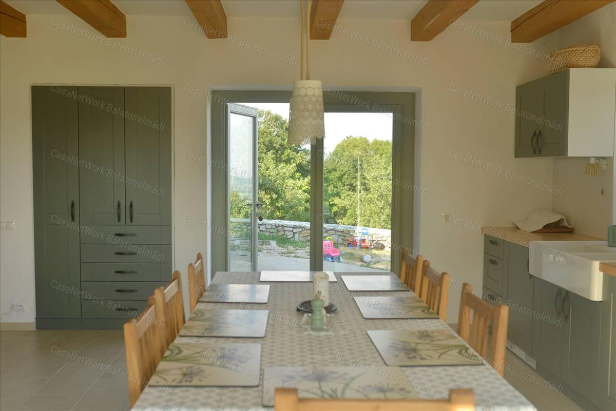 A 2015-ben épült, majd 2020-ban teljeskörűen felújított, nagyon hangulatos, két szintes családi ház hatalmas terasszal, nagy, száraz boltozatos pincével rendelkezik. a telken továbbá található egy panorámás kerti szauna fürdődézsával, egy kerti tó és sok-sok termő gyümölcsfa.